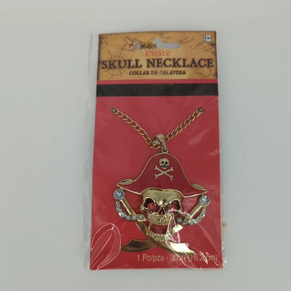 Enhance your pirate costume with this stunning 30" goldtone necklace adorned with a skull hat and swords. The necklace is designed by AMSCAN, a leading brand in costume accessories. Perfect for themed parties or Halloween, the necklace is sure to add a touch of adventure to your outfit. Made in China, this high-quality necklace features a gold color that complements any pirate outfit. Personalization is not available for this item. Get ready to set sail and conquer the seas with this must-have pirate accessory!