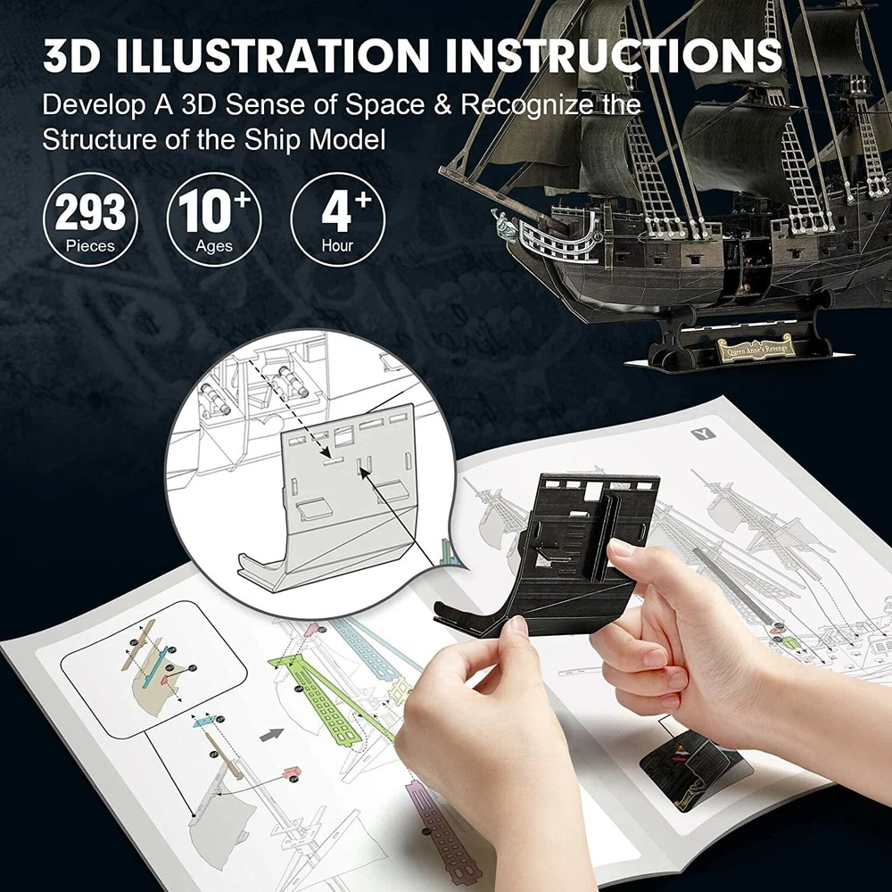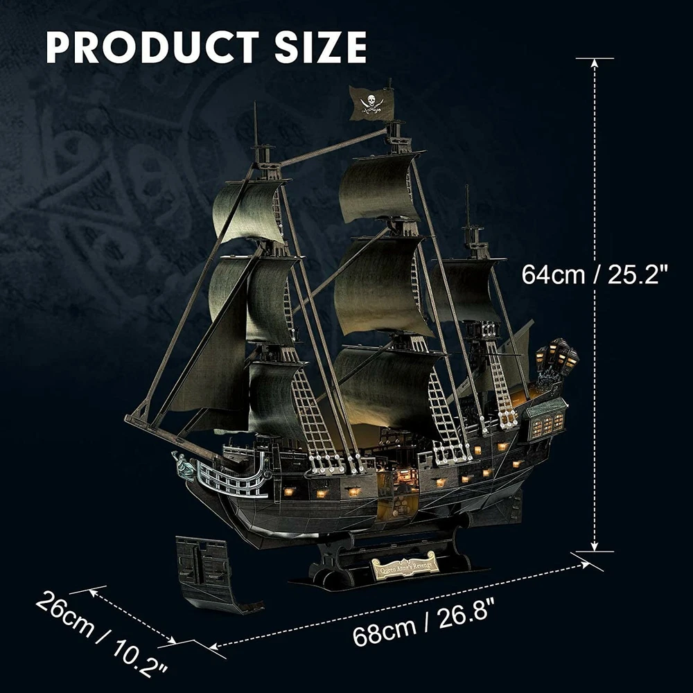 3D Puzzle for Adults Moveable LED Pirate Ship Decorations with Detailed Interior DETAILS 3D Puzzle for Adults Moveable LED Pirate Ship Decorations with Detailed Interior Style: LED Pirate Ship Material Paper and EPS Foam Board (with LED accessories) Brand CubicFun Style LED Pirate Ship Number of Pieces 293 Theme LED World's Great Architecture (Expert) About this item Enjoy The Adventurous Spirit: Hoist The Jolly Roger and Set Sail. Adventure on the high seas awaits with this LED 3D pirate ship model inspired by the Queen Anne's Revenge, the historic vessel that carried the notorious pirate Blackbeard on his conquests across vast seas. 2021 Upgrade Master Series Puzzles: New technology upgrade of CubicFun Pirate Ship, the openable hull access to detailed interior. 1:95 scale simulation Queen Anne's Revenge added 32 plastic deck guns will enhance the assembly experience. Craft and LEDs Upgrade: The simulated texture of the deck makes the visual experience more realistic. The 17 Large Warm Lights Beads will brighten your puzzle kits every night. It makes you feel like you’re in the Caribbean at night. 4H+ Assembly Experience: Pirate Ship included 293 pcs made of EPS foam board that you just need to assemble it step by step with the detailed 3D illustrated instructions. The material is flexible and solid to drift on the Sea through the storm. Build Model Size: 25.2 x 10.2 x 26.8 inches. 14+ years old recommended. Symbolic Centerpiece for Home and Office: The fascinating history of the Queen Anne's Revenge with this fabulous pirate ship model. Place one upon your office desk, or in any room of the house will add the thrill of the high seas excitement to your life. CubicFun Moveable LED Queen Anne's Revenge Pirate Ship with Detailed Interior Puzzles for Adults and KidsThe Black Pearl is a fictional ship in Pirates of the Caribbean. In the screenplay, we can easily recognize the Black Pearl by her distinctive black hull and sails. This turns out to be an advantage in more than one way. Not only do the black sails act as a sort of intimidation tactic, but the Pearl crew can put out the deck lamps for added stealth at night. Now you can get this beautiful 3d puzzle Queen Anne’s Revenge Blackbeard's pirate ship for your collection. You can find many details of the model and removable the hull will access the detailed interior. It’ll make a perfect gift for home or office decorator, boat enthusiast, or passionate collector. Unique Gift for Families & Friends - CubicFun 3D model are great for everyone age 14 to 99. These are perfect gifts for birthdays or as party favors. These are also wonderful prizes for yourself. Assembly Steps: -Follow the instruction on the booklet to building your puzzle. Each puzzle piece is numbered. -Punching out all the interlocking holes before assembly is advised. -Detach pieces you need by step of illustration can help you clearly identified every piece during the assembly. -The card slot is designed for the alignment of the wire and it also can be fixed during installation. Tips: -Pour your patience into the puzzle, don't force to interlock any two pieces/components. -Every puzzle piece has both sides and can be put into only one direction. Please keep the correct side of the pieces facing outward. -Assemble every section of the model just need your clever brain and hands, no glue or tools needed.