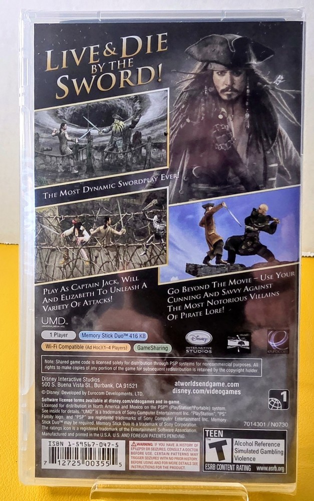 ESRB Descriptor:Alcohol Référence, Simulated Gambling, ViolenceRating:T-TeenPublisher:DisneyRelease Year:2007Platform:Sony PSPNumber of Players:1-4Country/Region of Manufacture:USAGame Name:Pirates of the Caribbean: at World's EndGenre:Action & AdventureControl Elements:Gamepad/Joystickbrand:Disney