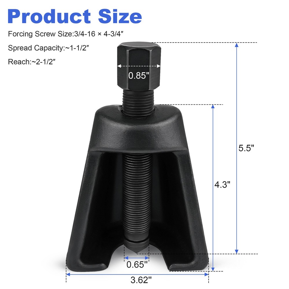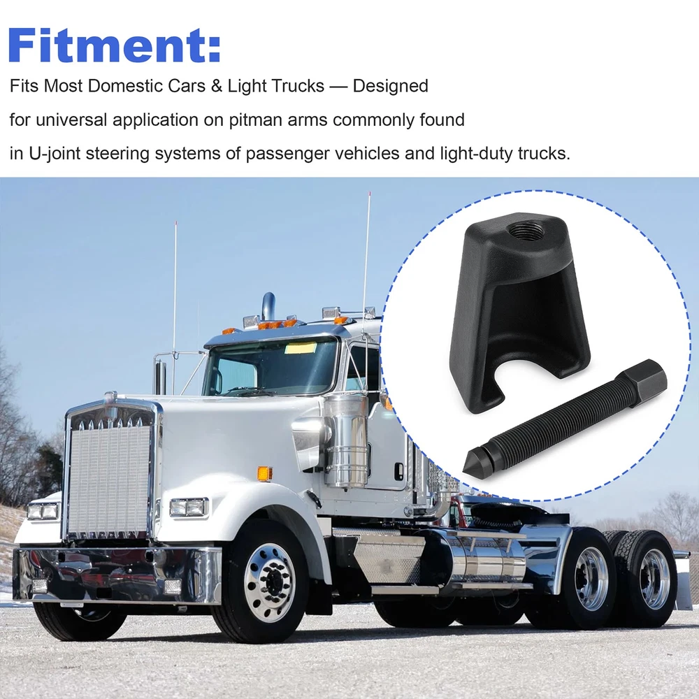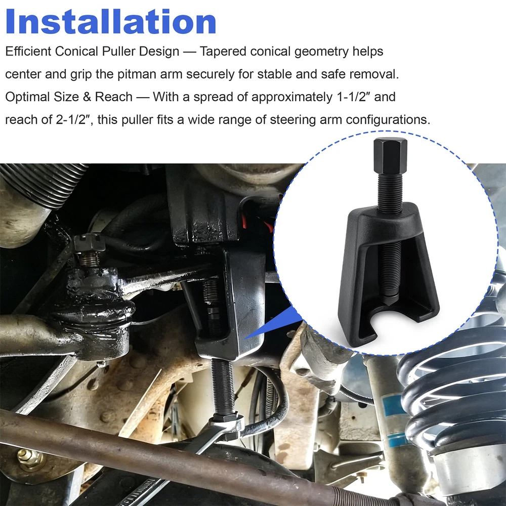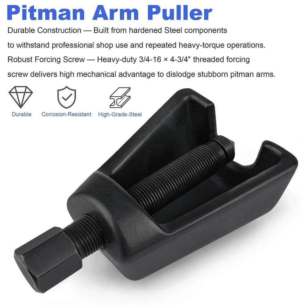 Pitman Arm Puller Tool for Steering System Service, Conical Puller Design Item specifics Condition: New Brand: Unbranded Tool Type: Pitman Arm Puller Application: Cars & Light Trucks Forcing Screw Size: 3/4-16 × 4-3/4″ Spread Capacity: ~1-1/2″ Reach: ~2-1/2″ Material: Steel Fits Most Domestic Cars & Light Trucks — Designed for universal application on pitman arms commonly found in U-joint steering systems of passenger vehicles and light-duty trucks. Efficient Conical Puller Design — Tapered conical geometry helps center and grip the pitman arm securely for stable and safe removal. Robust Forcing Screw — Heavy-duty 3/4-16 × 4-3/4″ threaded forcing screw delivers high mechanical advantage to dislodge stubborn pitman arms. Optimal Size & Reach — With a spread of approximately 1-1/2″ and reach of 2-1/2″, this puller fits a wide range of steering arm configurations. Durable Construction — Built from hardened Steel components to withstand professional shop use and repeated heavy-torque operations. Payment Delivery details Terms of sales About us Contact us Payment Paypal Preferred. Delivery details · USPS Standard Shipping. · Order processing: within 1 business day upon payment(excluding holidays and weekends). · Shipped from: US Warehouse Terms of sales · Please read the item description and check the pictures carefully before ordering. · Return or refund is available only if item DOA or there's error in item description causing the item not fitting the need. In such cases, seller pays for all related shipping cost. · Returns are also acceptable if buyer purchased this by mistake and item is still in good condition for reselling. Buyer is responsible for all related shipping cost. · Buyer need to file an application for return within 60 days after receiving the item. Items returned must be still in good condition as they were received. Return notes: 1.Please contact us for return and we will proceed with following instructions. 2.Returning the package with a tracking method, like USPS. The RMA#(Return Merchant Authorization Number=Your ebay ID) must be clearly written on the return package, otherwise the package will be refused. 3.Email us the return tracking number. 4.All returns will be inspected prior to a credit being issued. About us We are specialized in auto parts accessories for many years and we also sell items on ebay for several years. If you have questions about our items and services, please kindly feel free to contact us, we will try our best to satisfy you within 24 business hours. Contact us Please be free to email us by clicking the "Asking a question" link, once there is any pre-sale or after-sale inquiry for our items. We will email back in 24 working hours. If you'd like to put a neutral or negative feedback, or open the ebay or paypal case, please email us so we could try our best to resolve the issue.