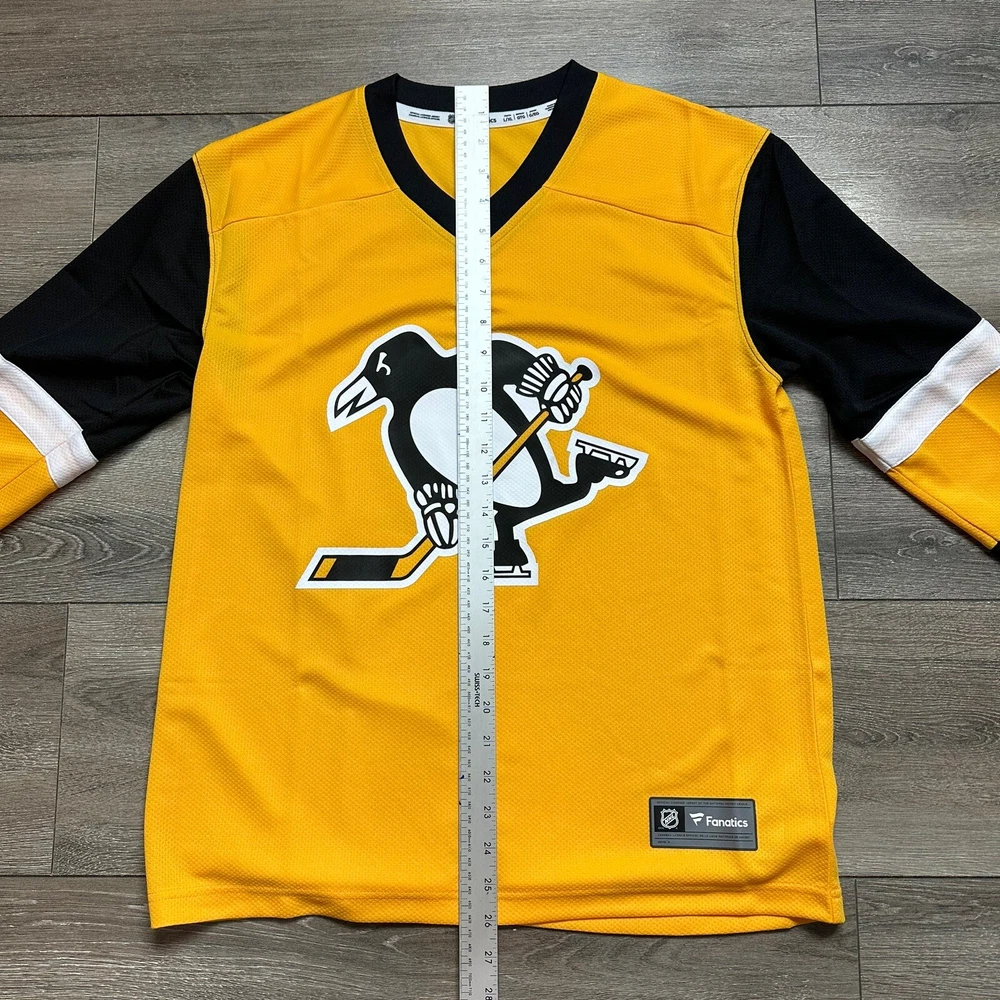 Product:JerseyColor:YellowTeam:Pittsburgh PenguinsSport:HockeyLeague:National Hockey League (NHL)Size:XLBrand:FanaticsPre & Post Season:Regular SeasonGender:Boys