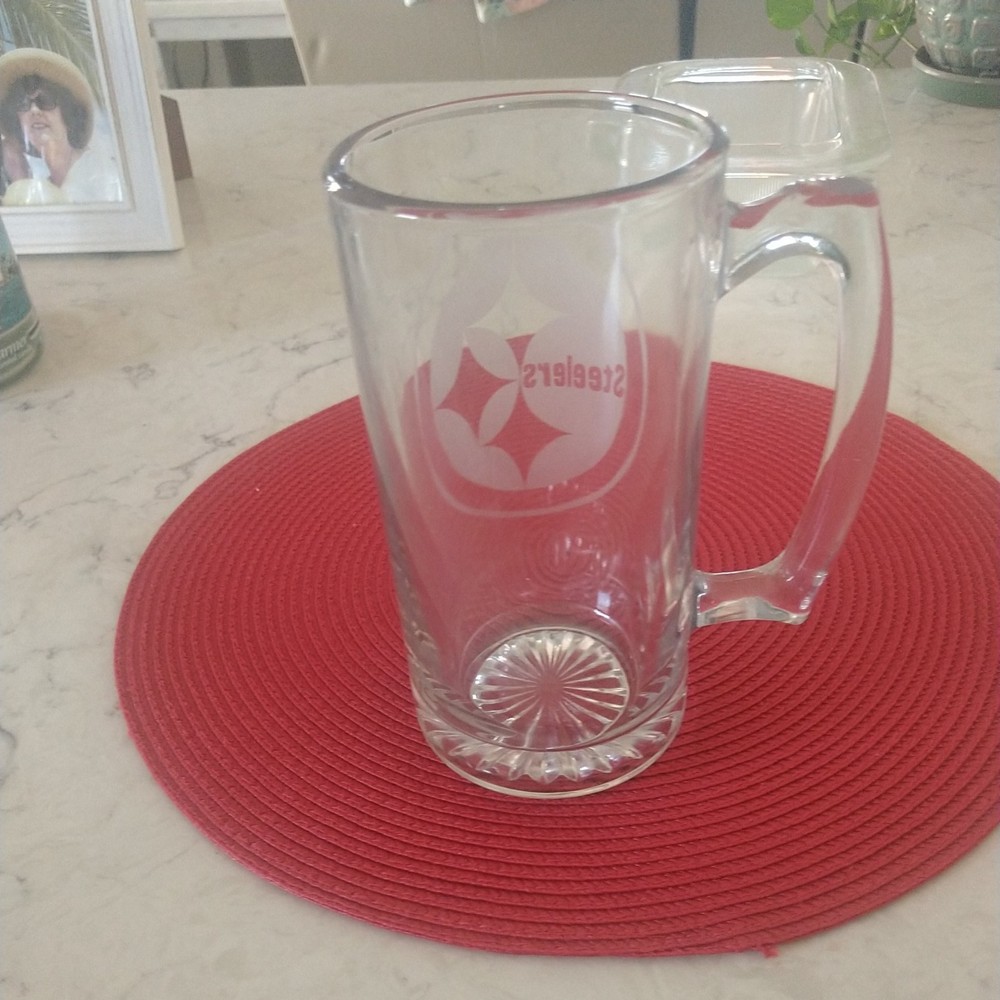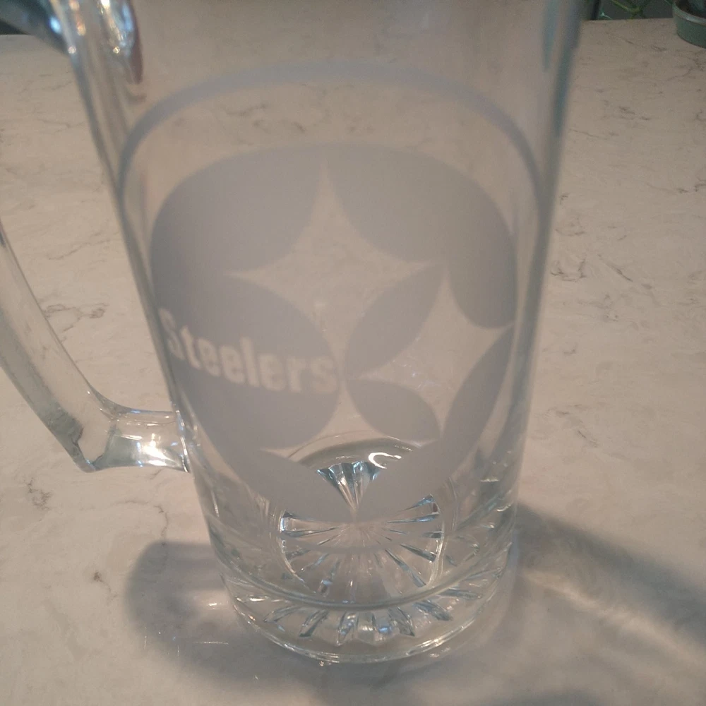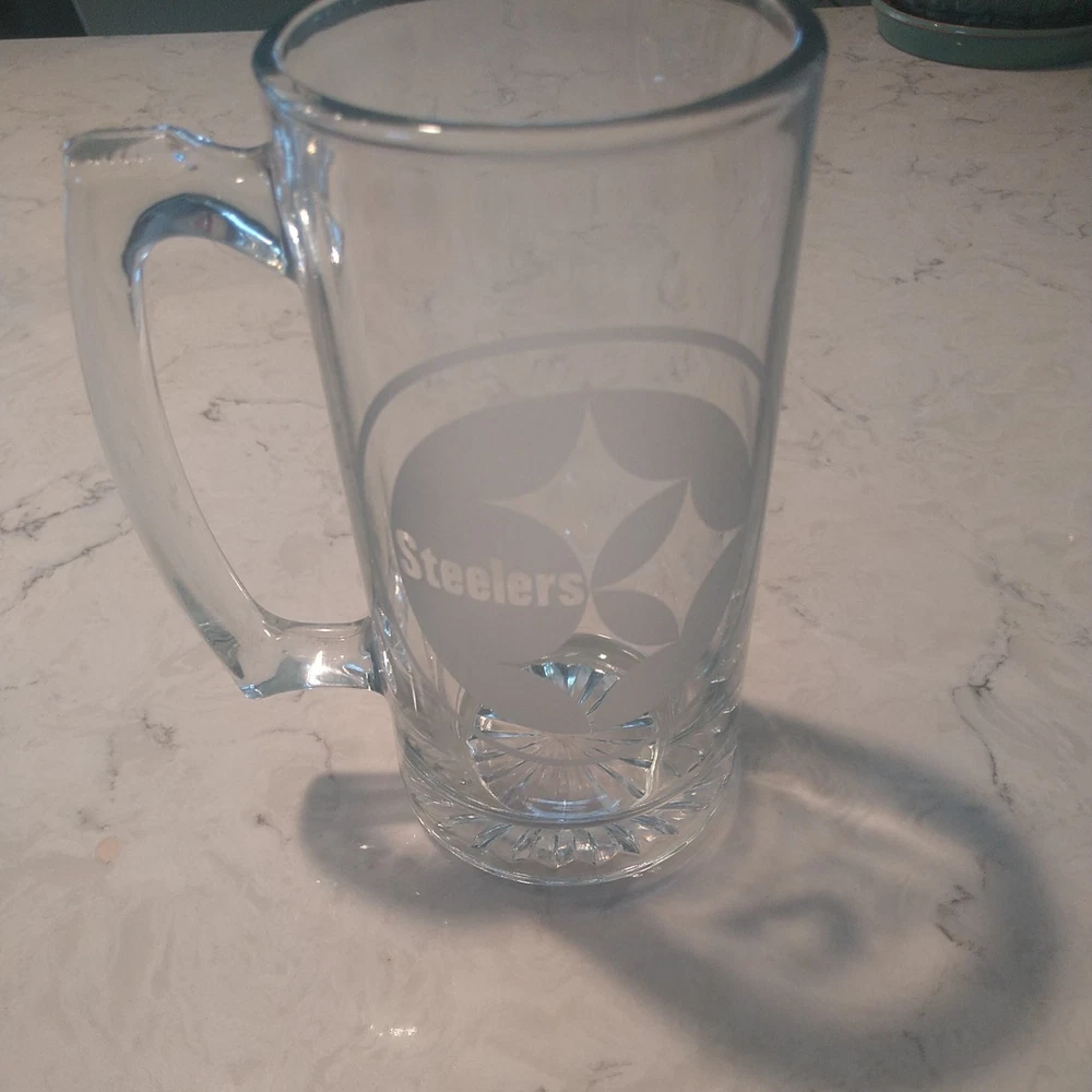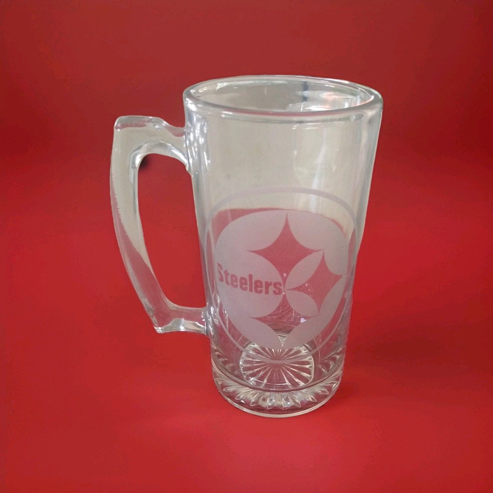 Embrace your love for the game with this robust Pittsburgh Steelers Beer Mug. A true fan favorite, the 24 oz jumbo mug is heavy-duty, etched glass designed to withstand the excitement of any sporting event. Its solid clear glass structure is complemented by a functional handle, making it an ideal choice for enjoying your favorite beverage. The mug features a dishwasher-safe design that simplifies cleaning. It's perfect for all occasions, whether you're watching the game or just enjoying a casual evening in. With its 7-inch height and 3-inch width, this mug is a versatile addition to any collection, holding up to 24 fl oz of your favorite brew.