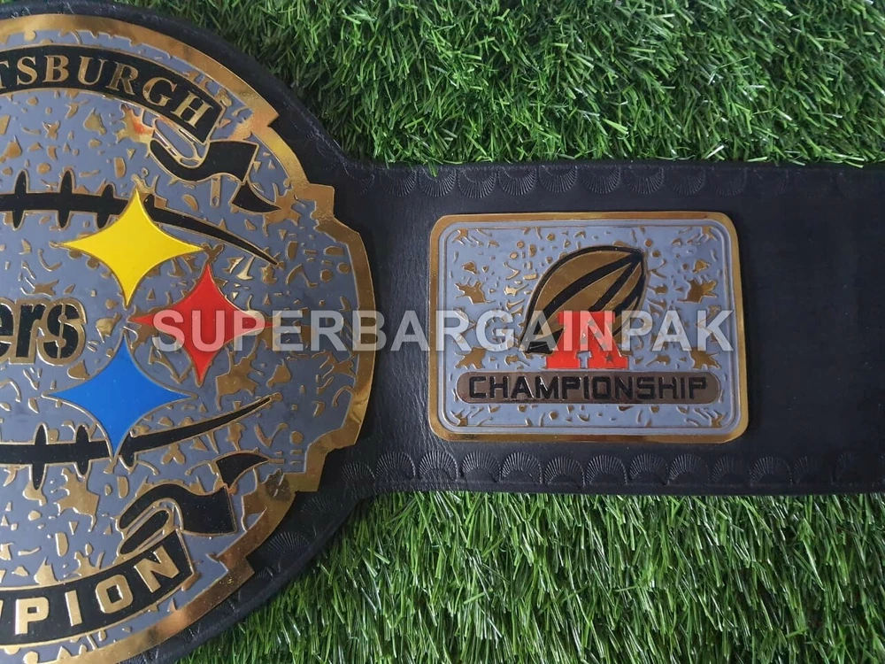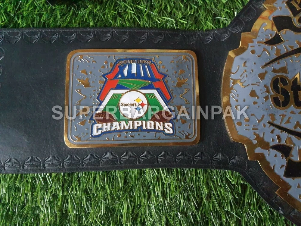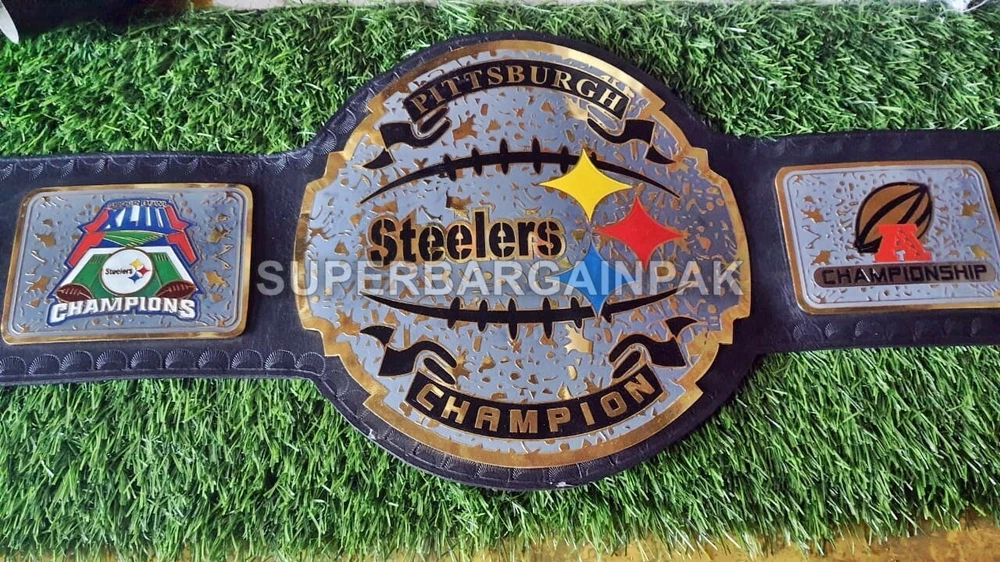 Welcome to our shop ------------------------------------------- We are specialist in manufacturing handmade products:: Our wide range of products include: >>>>Championship Belts WWE | WWF | AEW | UFC | WBC | WCW Product Description ** Pittsburgh Steelers Championship Belt *** Plate Metal: Brass (Zinc available on request with additional cost) Strap: 100% Leather Largest Waist Size: Fits upto 46'' Belt Length: ~50" Weight: 4.17 lbs | 2.01 Kg Plate Thickness: 2mm (4mm Version available on demand with additional cost) ::The belt is well crafted and manufactured to meet the quality demands of fans:: Get your hands on this marvelous piece now! Note: If you need further details kindly inbox us, we will try to be as responsive as possible. ------------------------------------------- Return Policy: Generally we don't have much complains on our products and we make sure to 100% satisfy our clients. We send the product in well Bubble Wrapped packaging so there is highly unlike chance of getting damaged item. In case there is a damage, we will try to give partial refund or you can ask for full refund within 30 days after returning the belt to origin. NOTE: 1. If you have placed the order by mistake or you have purchased a wrong item then we are not going to refund that. 2. Buyer will pay the shipping fee of returning the belt. ------------------------------------------- Happy Shopping! :)