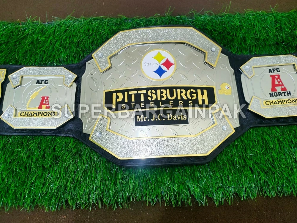 Welcome to our shop ------------------------------------------- We are specialist in manufacturing handmade products:: Our wide range of products include: >>>>Championship Belts WWE | WWF | AEW | UFC | WBC | WCW Product Description ** Pittsburgh Steelers championship belt *** Plate Metal: Brass (Zinc available on request with additional cost) Strap: 100% Leather Largest Waist Size: Fits upto 46'' Belt Length: ~50" Weight: 6.17 lbs | 2.81 Kg Plate Thickness: 2mm (4mm Version available on demand with additional cost) ::The belt is well crafted and manufactured to meet the quality demands of fans:: Get your hands on this marvelous piece now! Note: If you need further details kindly inbox us, we will try to be as responsive as possible. ------------------------------------------- Return Policy: Generally we don't have much complains on our products and we make sure to 100% satisfy our clients. We send the product in well Bubble Wrapped packaging so there is highly unlike chance of getting damaged item. In case there is a damage, we will try to give partial refund or you can ask for full refund within 30 days after returning the belt to origin. NOTE: 1. If you have placed the order by mistake or you have purchased a wrong item then we are not going to refund that. 2. Buyer will pay the shipping fee of returning the belt. ------------------------------------------- Happy Shopping! :)