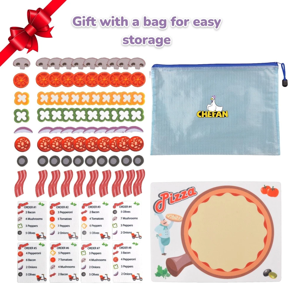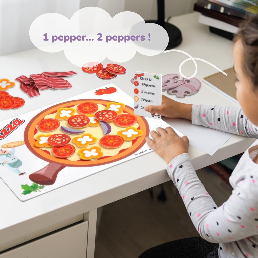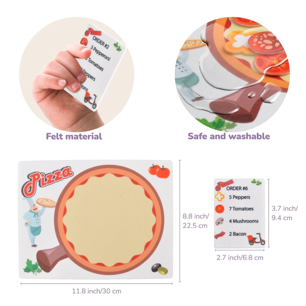 Pizza Making Math Game Set Looking for interesting and interactive way for your little ones to practice counting and number recognition? Try Pizza Counting and Making set, learning Numbers has never been so fun with this pizza making activity! 3 Steps to make the Pizza: Follow the pizza order Reconize the ingredients and Count the needed number Put all needed ingredients on the crust! Hands On Learning Value: Learn all ingredients Number recognition Counting Sorting Hand-Eye Coordination Features:1. Set includes: 8 Felt Order Recipe Sheets measure 2.75 inches x 4 inches, 1 Felt Crust/ Acitivity Sheet measured 12inches x 9inches), 8 Sets of Felt Pizza Ingredients measure from 1.5 inches to 3 inches, 1 zip storage bag measures 12.5 inches x 9.5 inches 2. All ingredients, crust and pizza order are made of durable felt, easy to clearn and child friendly. Set contains Small Parts, Choking Hazard, Not for children below 3 years old. Package Includes: 8 Felt Order Recipe Sheets, 1 Felt Crust/ Acitivity Sheet, 8 Sets of Felt Pizza Ingredients include: Bacon, Mushroom, Green Pepper, Yellow Pepper, Pepperoni, Oliver, Onion, Tomato(10 pieces each), 1 Storage Bag. Pizza Making Math Game: follow the pizza order, count out the ingredients, and put them on the crust, this pizza toy provides a fun way for little ones to practice counting, a great toddler learning toy. Design For Toddler: these colorful, familiar pizza ingredients will introduce early math in an attractive way, kids can learn color & shape, basic mathematics concepts such as counting, patterning and addition. This educational toy is suitable for toddler activities or math games for kindergarten. Easy To Clean: this pizza play set including Order Recipe Sheets are made with high-quality and felt materials that wipe clean with ease. The felt pieces could handle all kinds of interaction with toddlers, these manipulatives are all durable, no tear down or easy to bend. Give the Gift of Learning: Great gift option for holidays, birthdays, this educational toys from will help you discover new learning fun every time you give a gift!