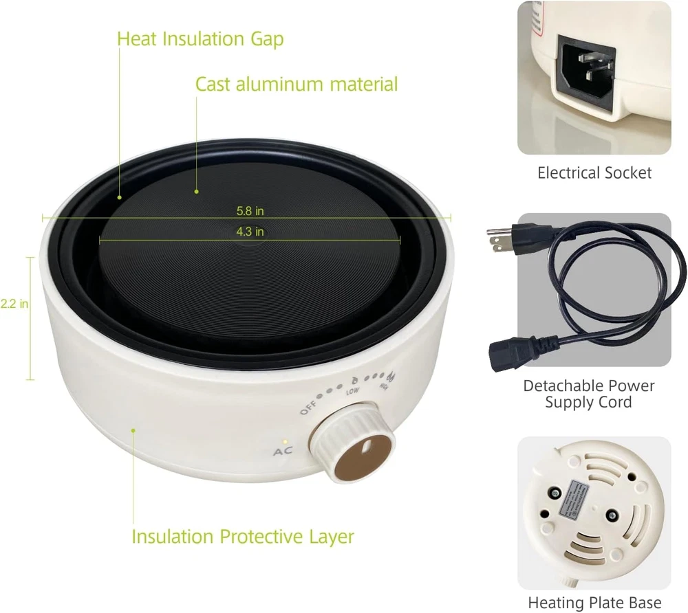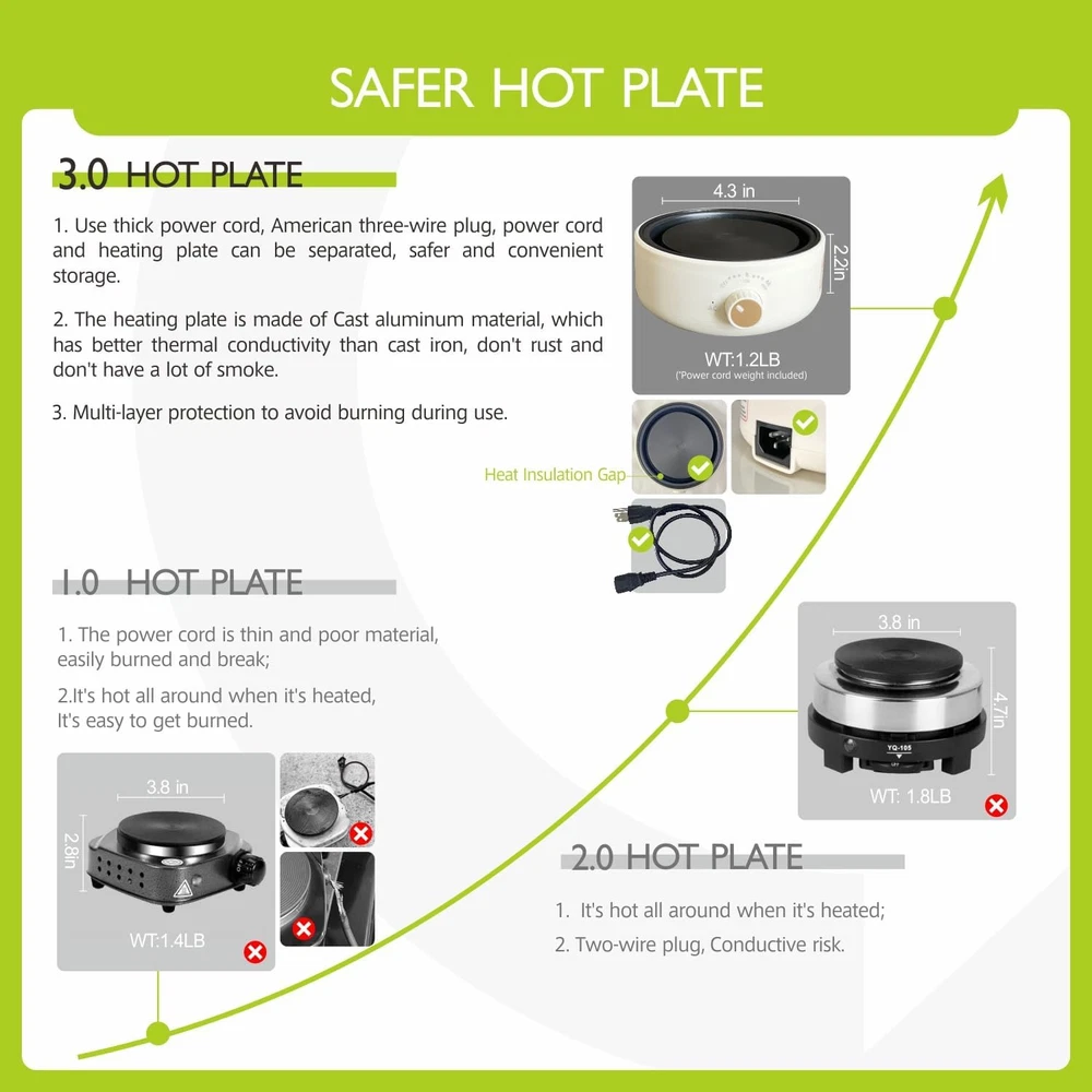 Store New Arrivals Add to Favorite View Feedback Contact Portable Hot Plate,Electric Stove - 500W Heat Plate, Single Burner,Electric Heater, Perfect Size for Moka Pot, Melting Wax and More, Suitable for Kitchen, RV Camping, Outdoor Description Item model number ES01 Heating Elements 1 Manufacture Year 2024 Product Dimensions 5.8"D x 5.8"W x 2.2"H Power Source Electic Color white Material Plastic Country of Origin China Burner type Coil Controls Type Knob Item Weight 1.37 pounds Voltage 110 Volts Included Components 1x 500W electric stove , 1xPower Cord, 1x User Manual. Special Feature Electric Wattage 500 watts 👍【SAFER ELECTRIC STOVES】Double layer design reduces the risk of burns. This heating plate is made of Cast aluminum material, which has better thermal conductivity than cast iron, don't rust and don't have a lot of smoke. thick power cord, American three-wire plug, power cordand heating plate can be separated,safer and convenient storage. 🌸【WIDELY USED】This electric stove and melt pot, also can be used for Candle making, soap making, coffee heating,chocolate DIY, Butter melting,making tea etc.Suitable for homemade, dormitories and offices, compact and lightweight, easy to carry and store. 【Electric Camping Stove】 500W small electric hot plate is great for camping with a portable power station. 【Saves Space】 mini electric stove is compact,takes up very little counter space,small enough to pack,suitable for home,hotel,office,camping,and your RV. Product Description SAFER HEATING PLATE 1.0 HEATING PLATE 1. The power cord is thin and poor material, easily burned and break; 2.It's hot all around when it's heated, It's easy to get burned. 2.0 HEATING PLATE 1. It's hot all around when it's heated; 2. Two-wire plug, Conductive risk. 3.0 HEATING PLATE 1. Use thick power cord, American three-wire plug, power cord and heating plate can be separated, safer and convenient storage. 2. The heating plate is made of Cast aluminum material, which has better thermal conductivity than cast iron, don't rust and don't have a lot of smoke. 3. Multi-layer protection to avoid burning during use. ABOUT US We offer the best prices around on high quality products. Our E-store includes media such as books, movies, music and games while offering electronics, toys, sporting apparel, clothing, tools, general home, garden items and more. SHIPPING We are always working hard to ensure your package arrives as soon as possible. Please understand that some factors like weather, high postal traffic, and the performance of shipping companies are outside of our control. We offer free shipping to the lower 48 states and ship within 2 business days of payment, usually sooner. We do not accept P.O. Boxes. Please provide a physical address. For shipping outside of the continental USA, we only use eBay's Global Shipping Program.The item is shipped to KY and then sent to the rest of the world. International customers are responsible for all duties and taxes. Continue to check out in order to calculate costs for shipping the item to your country. Messages regarding eBay's Global Shipping Program MUST be directed at eBay EXCLUSIVELY. RETURNS We offer a 30-Day Return Policy on items which you are not completely satisfied with. You have the option for a full-refund or an exchange of the item. No returns are available on items shipped outside of the USA. PAYMENT We accept PayPal. CONTACT US This page content is yet to come Please ad us to your favorite seller and visit again later Thank You CUSTOMER SATISFACTION We try our very best to make sure every customer is completely satisfied. If there's a problem, message us! We're happy to help. WE ACCEPT Copyright © 2021 AutoDS. | All Rights Reserved
