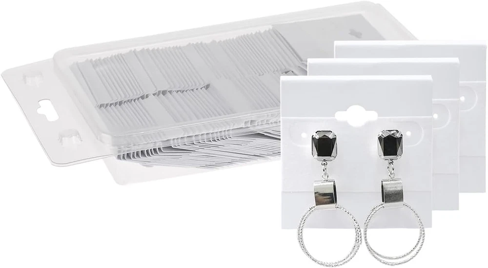 HANGING EARRING CARDS - 100 high-quality hanging earring cards with 6 holes to hold various earrings such as studs, clusters, drops, hoops, chandeliers, Halo, huggie, and climber earrings. EARRING DISPLAY- Elevate your jewelry display with our sophisticated White Velvet Fabric Earring Cards. These elegant fold-out tab earring cards offer both style and security, all while boasting a luxurious black velvet fabric for an undeniably sleek aesthetic. Earring Organizer: Our earring cards can efficiently store or display earrings, offering space-saving and organizational benefits. EARRING ORGANIZER: We provide the best hanging earring cards. With two decades of experience in the United States market, we have gained a deep understanding of our customer's requirements, allowing us to tailor both the quality and design of our products to meet your needs. MATERIAL & SIZE - Flocked plastic; Overall: 2"W x 2"H Official MOOCA product. Accessories are NOT included Product Description FEATURES Perfect and elegant earring cards for hanging earrings. Featuring precut 6 holes which are suitable for a variety of earrings. Perfect for organizing your earring in place. Made of high-quality plastic and come in a pack of 100 pieces. Elegant and sophisticated earring cards Sleek and simple This plain white plastic earring card holder is sleek and simple. Illuminating your earrings on display. Pack of 100 pieces These cards come in a pack of 100 pieces for multiple earrings. For a variety of earrings. Efficient and practical design The earring card can be hung in 2 different ways. Either on a rack or a hook. Perfect for displays This earring card is perfect for displaying at trade shows, shops, etc. Easy to use and saves space. 100 Pcs Hanging Earring Card Holders, Plain White Overall: 2"W x 2"H each