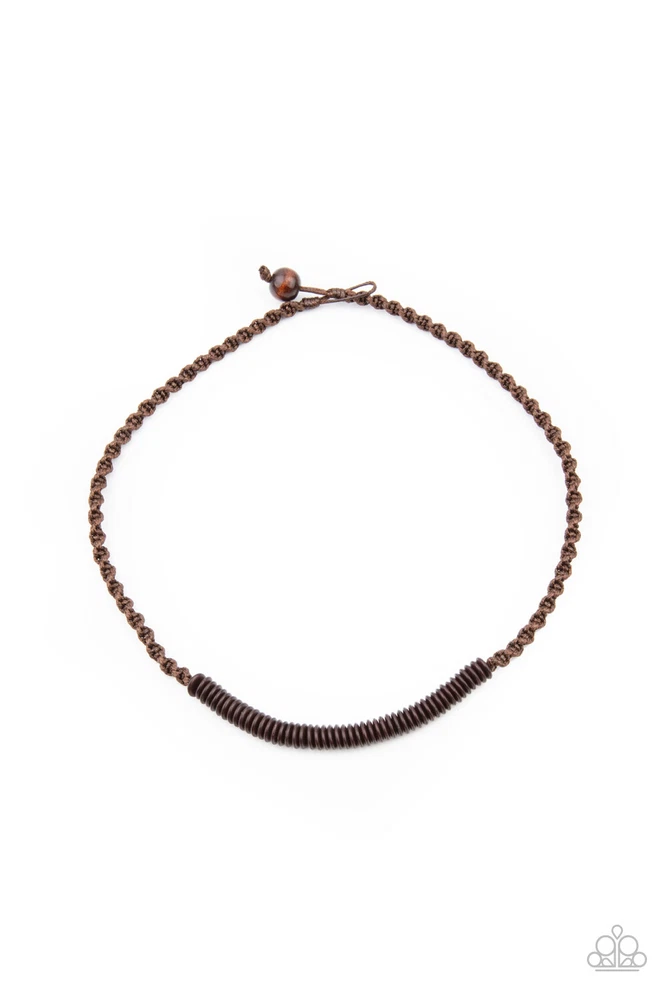 Plainly Primal - Brown - Paparazzi Accessories Men's Necklace Item ID Number: 1230 Color Brown Description A dainty row of black wooden discs are knotted in place along a strand of brown cording that decoratively braids around the neck. Features a button loop closure. Sold as one individual necklace. Additional Images