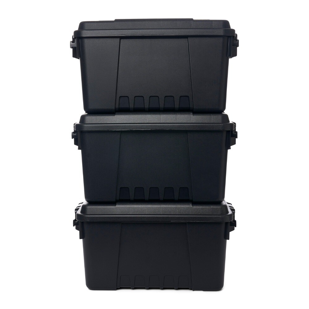 Plano Sportsman's Trunk 3 Pack, Black, 14-Gallon Lockable Storage Box 3 Trunks in one box provides built-in efficiency and value PLANO SPORTSMAN’S STORAGE TRUNK: Store or take your tools, hunting gear, ammunition, camping supplies and more on the go with the Plano Sportsman’s Trunk. With a 14-gallon capacity, the possibilities are endless. LOCKABLE & WEATHER-RESISTANT: Tough, snap-down latches secure the lid shut – keeping loads secure and weather out. Padlock tabs provide maximum security.