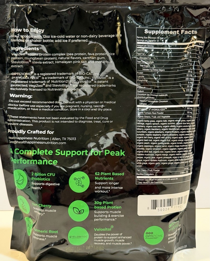 Premium Vegan Sport Protein Powder: Packed with 30g of plant-based protein, 5.5g BCAAs, VELOSITOL, OPTIZIME P3 Hydrolyzer, 62 organic veggies and fruits, and 2 billion CFU probiotics, this non-dairy protein powder is designed to fuel your fitness journey. Perfect for anyone seeking a vegan vanilla protein powder for optimal sport performance. Enhanced Recovery and Strength: VELOSITOL, backed by six scientific studies, accelerates recovery, enhances strength, and boosts performance, making this the ultimate sport protein powder for athletes and active lifestyles. OPTIZIME P3 Digestive Support: Featuring an innovative enzyme blend, this vegan protein powder increases Total Amino Acid (TAA) absorption by over 30% within 45-60 minutes, helping your body make the most of every scoop. Clean and Natural Nutrition: This plant-based protein powder is crafted with 62 organic ingredients, including tart cherry, turmeric root, elderberry, bilberry, and mushrooms. It's free of GMOs, gluten, artificial flavors, and added sugars. Certified by Informed Sport, it’s a safe and natural choice for high-performance athletes. Easy to Mix, Delicious to Enjoy: Blend two scoops of our vegan protein powder vanilla with 12oz of cold water, non-dairy milk, or your favorite beverage for a rich and creamy vanilla vegan protein drink. Ideal for anyone who values smooth, delicious recovery shakes