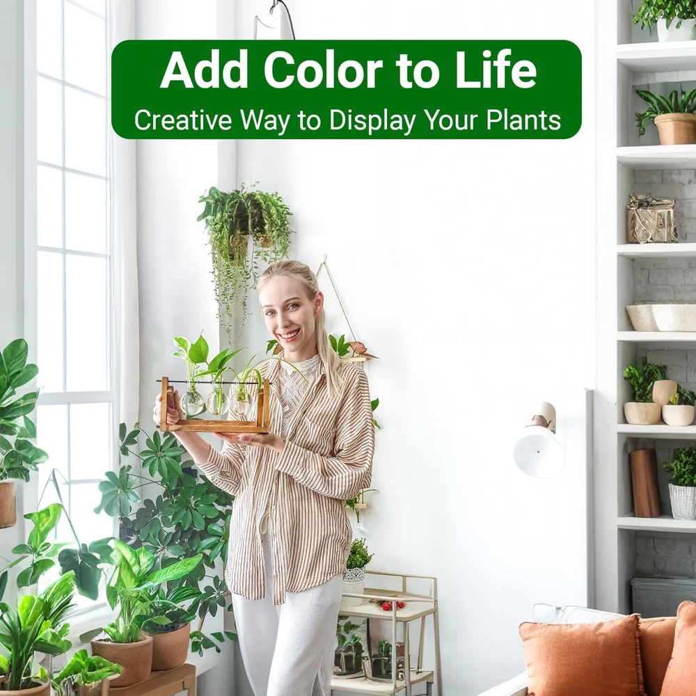 🎁Plant lovers gift ideas:unique gifts for women,birthday gifts for women,plant lover gifts for women,small gifts for women planters,gifts for mom,gardening gifts for women,mom birthday gifts,cool gift for moms birthday,wife birthday gift ideas. Great nice Gift for women, mom, friends and plant lovers.Office decor for women,desk accessories for women,bookshelf decor,housewarming gifts new home,womens gifts,anniversary gifts for women 🎁Plant propagation station:gardening vintage house decor designed with mini bulb glass vase,vintage décor,dark academia décor. Beautiful propagation vases for plants and eye-catching desk decor terrarium kit. Nice photo prop, prefect for indoor plants propagations and cuttings! Propagates your plants live houseplants‘ babies in style, office decor bulb glass container with plenty of room for plant's roots and all are visible for observing its growth condition. 🎁Plants Terrariums Size:The plant cutting holder wooden stand size is 11" L x5.5" H x 4.4". Each Vase is 2.8"D X 4"H; Opening Diamter is 1.4". A nice touch to any room, put it on window sill, desktop, shelf and bedside for decoration in livingroom, ding room, kitchen, cafe and office.A gift ideas stylish way to display the houseplants,indoor plants, terrarium plants,mixed bouquets and water rooted plants, likes Scindapsus, Pothos vine, Bamboo plant, even for Herbs. Great for floral arrangement, cottagecore decor,home decor, boho decor,as well as various office gifts,retro decor,cubicle accessories,prop drops plant propagation. 🎁Propagation vases for plants:Planters for indoor plants.Convenient installation, you don't have to worry about the glass bottle breaking.Fit the two wood pieces together and run the metal bar through the holes in the glass and secure it with the enclosed tiny rubber gaskets. The metal bracket allows you to easily pour the water or change plants. 🎁𝐁𝐫𝐞𝐚𝐤𝐚𝐠𝐞-𝐏𝐫𝐨𝐨𝐟 𝐏𝐚𝐜𝐤𝐚𝐠𝐞:1 x wooden stand(2 pieces), 3 x bulb vase, 1 x metal swivel holder, 8 x rubber fixed plug,2 x screws and 1 x manual. No plants or props included in this item! We guarantee FREE replacement for any damaged product. 🎁Great gifts for women plant lovers:Plant starter for Birthday, Mother's Day, Christmas, Valentine’s Day, Thanksgiving gift ideas. Nice present to your nature-loving, gardeners. Sweet wedding party, anniversary, housewarming and special occasions decoration gifts. 🎁Wider and stronger wood quality:Natural wood texture, more considerate and stylish packaging,propagation vases for plants. As time goes by, the color will become more and more beautiful. Product Description Ivolador Plants Propagation Station, Gardening Gifts for Women Plants Lover The video showcases the product in use. The video guides you through product setup. The video compares multiple products. The video shows the product being unpacked. hero-video Merchant Video Ivolador Desktop Plants Propagation Stations, Plants Vase Indoor Plants propagation station- unique "swing" design puts the focus on your plants and gives unobstructed visibility to the health and growth of your plants. Material: wood, glass, metal and rubber Size: 5.5" H x 9.5" W x 4". Each Vase is 2.8"D X 4"H Package: 1 x wooden stand, 3 x bulb glas sbottles, wingnuts x 2 Note: No plants or other decorative objects included in this item! Tabletop Plants Planter Fit nicely in windowsill, bathroom ledge, also looks gorgeous as the centerpiece on your table. Easy to clean and water changes The metal bracket allows you to easily pour the water and change the plants. Gift for women, mom, sister, friend, Grandma Plants lovers really enjoy it. A propagation station is a great way to bring new joy to your plants. Perfect for growing plants cuttings Use it to showcase your favorite flowers or plants and add a touch of nature to any space. Adjustable Stand Width The Triangle Design stand will be more sturdy, could adjust it according to your personal placement. 1 Plants PropagationStation 2 Unique Plants Terrarium 3 Plants Lover Gifts 4 Propagated your plants 5 Office Home Decor Best Gift for Plants lover Ivolador Elegant Gift Box - Ready to gift! Best indoor Home decoration as well as a gift on Mother's Day, Christmas, Valentine's Day, Thanksgiving, anniversaries, housewarming and birthday parties. . Sweet wedding party and special occasions decoration gifts. Make a great gift for the plant-lover in your life. Package includes: 1 x wooden stand (2 pieces - 1 wide and 1 narrow), 3 x bulb bottles 1 x metal swivel holder, 8 x rubber fixed plug, 2 x wingnuts + screws, 1 x manual ***** No plants or props included in this item! Plants Propagation Station -Novel Swing Design Novel swing design, make these glass vases look like swings, decorate any places like home, garden, bathroom, kitchen, or living room, bring the nature green into your life. Amazing Globe Customers Show Choose these plants Propagation Stations in your interior design. This is a simple temperament but it can also surprise many garden lover. Cool gifts for women It is easy to put together and use. Propagate regularly and this is much better than jars or cups. It looks nice and neat. The simplicity is beautiful. So you can see the progress of propagations easily. Home office decor Garden, home, office, kitchen and bathroom decoration. Retro and charming, adding a simple and classic feel to your living space. Ivolador Plant Propagation Station, Gardening Gifts for Plant Lovers