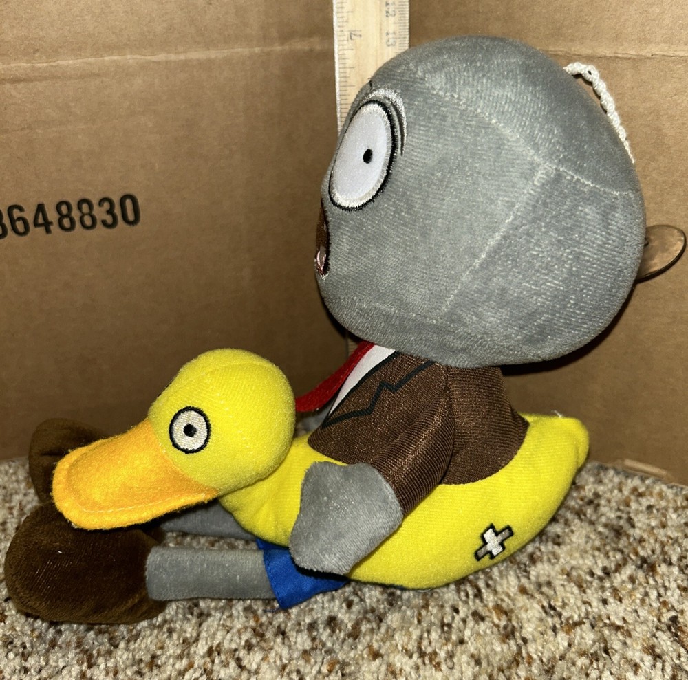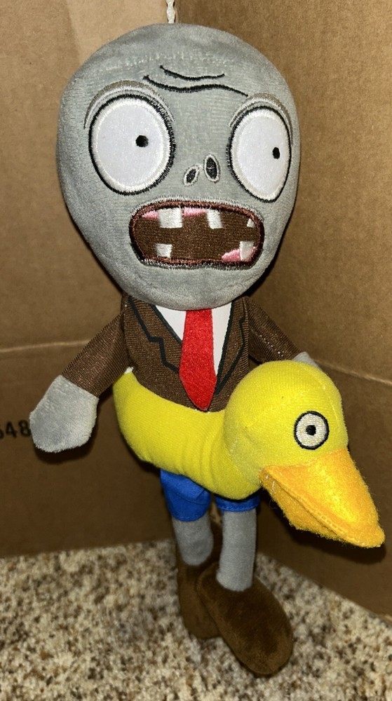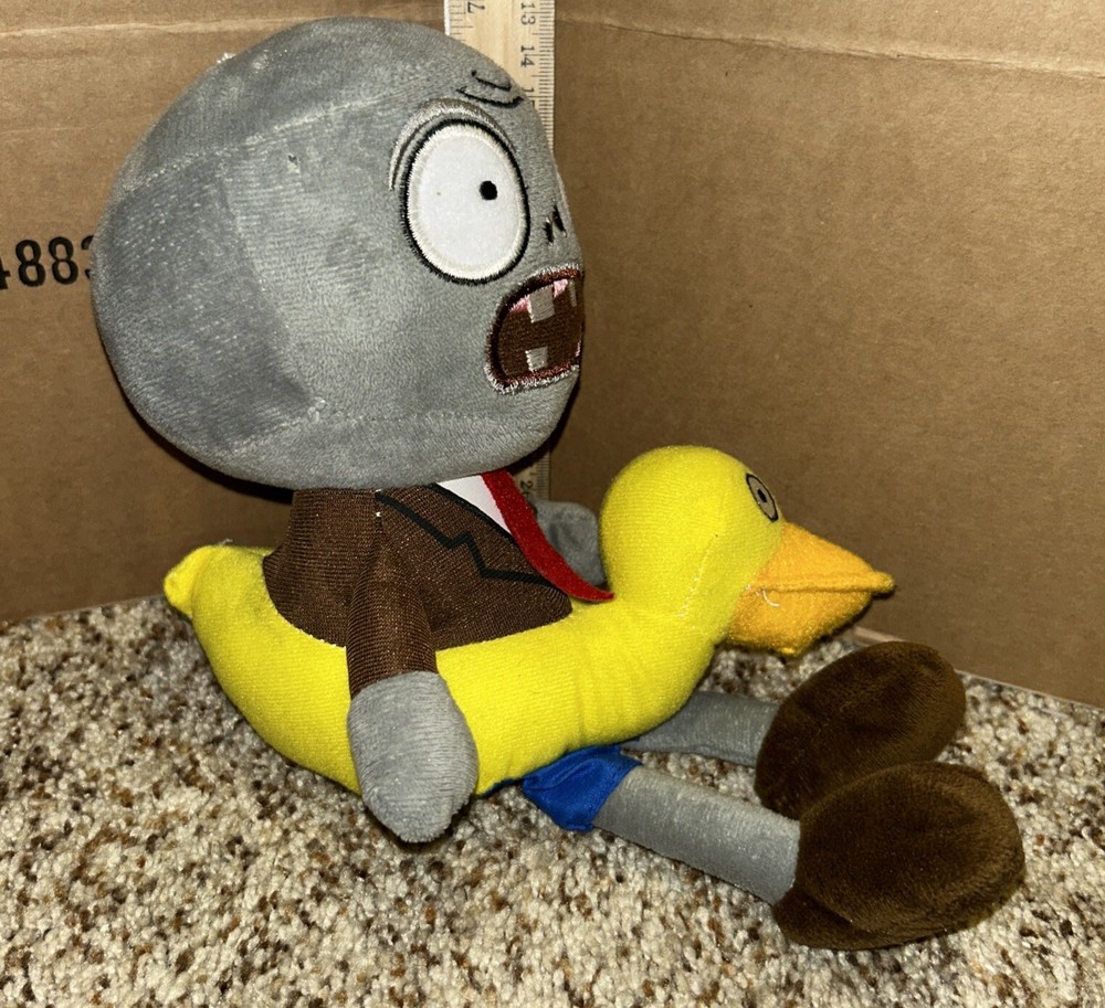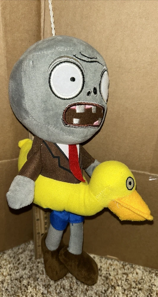 This is a 12-inch Plants Vs Zombies plush featuring a Zombie character holding a rubber duck floatie. The plush is designed in a Zombie theme and is made of soft plush material. It is a rare and out-of-production (OOP) collectible item from the franchise. The Zombie character is specifically designed with a duck, adding a unique and playful touch to the collectible.