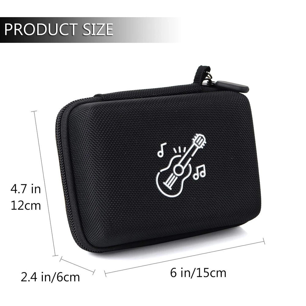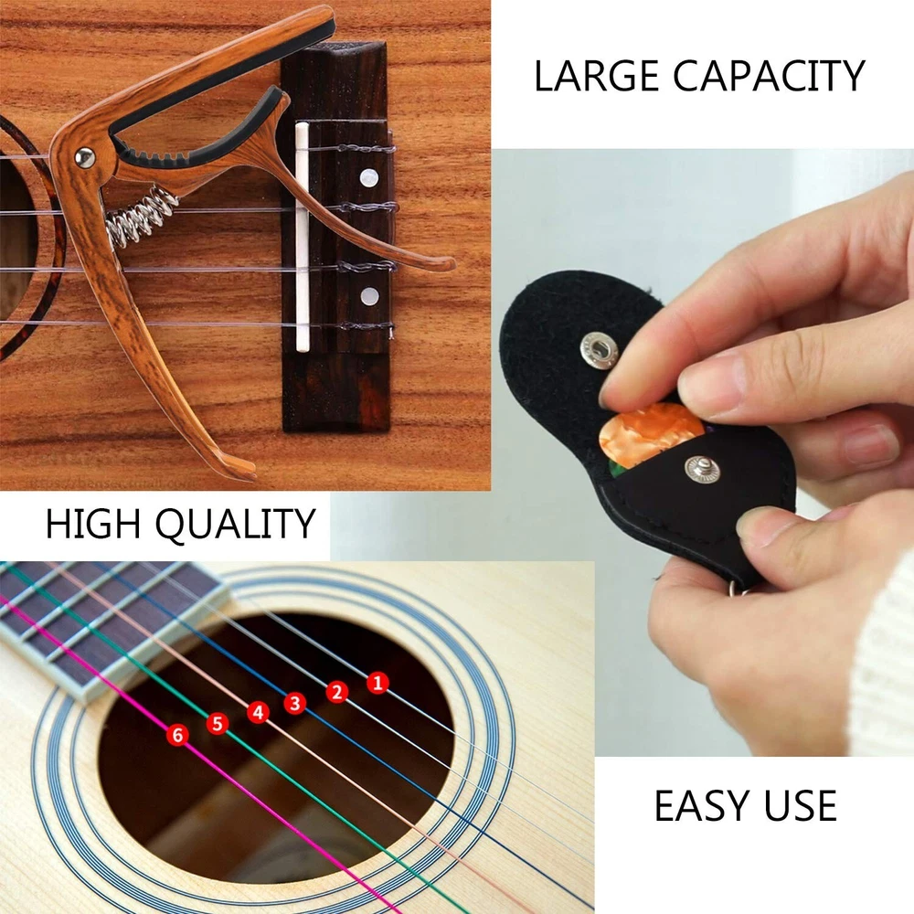 PlasMaller Guitar Picks Holder Case Bag Set, included Upgrade Capo + Guitar Strings + 30pcs Acoustic Electric Guitar Colorful Picks + Little Picks Holder (Black) Product Details Item Weight: 7.8 ounces Package Dimensions: 6.26 x 4.61 x 2.24 inches Item model number: LICHUAK-501-01 Date First Available: January 18, 2021 Color Name: Type 2 Compatible Devices: Guitar, Ukulele, Banjo Guitar Pick Thickness: Medium Material Type: Ethylene Vinyl Acetate (EVA) Size: Small DESIGN & FABRIC- Made of hard EVA material with good water resistance and dustproof, soft interior cushions the impact of your guitar picks STRUCTURE- 6 x 4.7 x 2.4 in, small size allows you to easily put guitar holder in your bag; With a sturdy hand strap makes it easy to carry; Smooth strong zipper easy to open and close; Soft inner foam cut fits your picks snug and more stable; Inside extra mesh pocket allows you to store the tuner, capo, strings, straps PACKAGE- Included Quality 30 pcs Celluloid picks (3 Different Thicknesses - Thin 0.46mm * 10, Medium 0.71mm * 10, Thick 0.96mm * 10; Color is random) + 1 extra little picks holder + 1 Upgrade Capo + 2 Guitar Strings (Each set including 6 strings) PRACTICAL- Large capacity, this storage case can hold 50+ picks, enough space for all your picks and other accessories , keep your guitar accessories well organized and safety IDEAL GAME GIFT- Whether it is a party or a trip, this guitar kit holder set will be a good choice; Also is a wonderful gift for kids, friends or guitarist