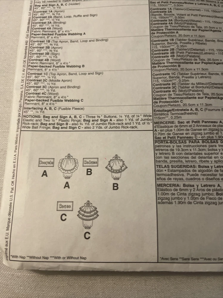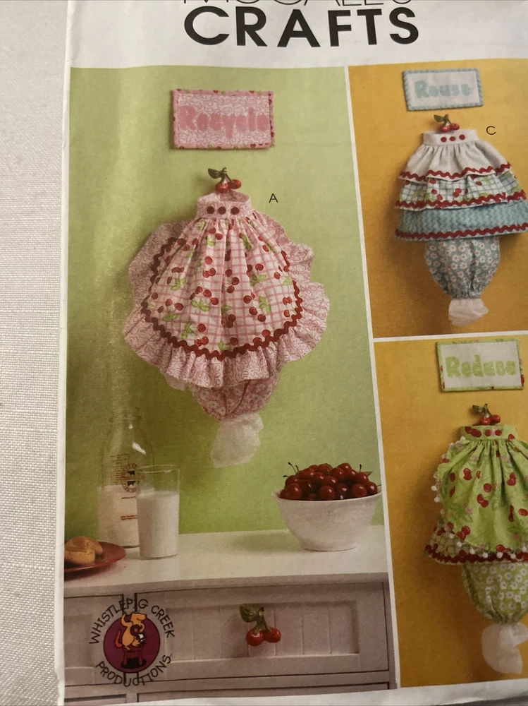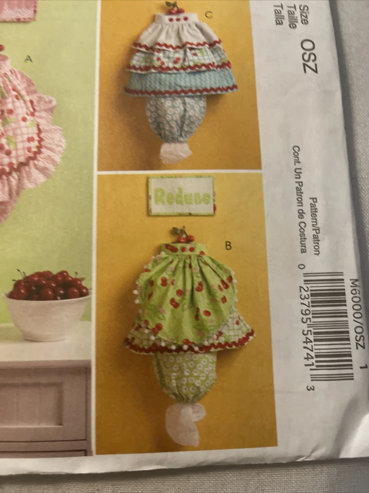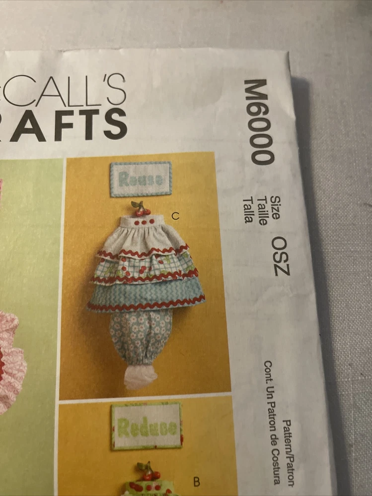 This sewing pattern from McCall's Crafts, labeled M6000, allows you to create a plastic bag dispenser designed to fit any home decor style. The uncut pieces included in this pattern can be used to make a functional and stylish addition to your home. This pattern is suitable for adults and teenagers of both genders, and is not considered vintage.