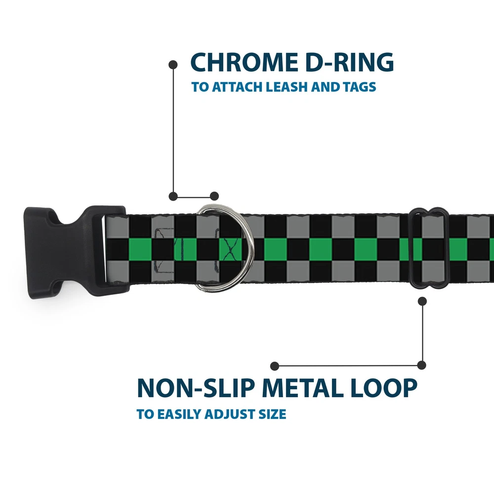 Further Details Title: Plastic Clip Collar Checker Black/Gray/1 Green NARROW-Medium 8.5-12" Condition: New Release Date: 03/16/2017 Description: Vibrant and bold, this beautiful, polyester dog collar is made to show off your dog's unique style through all the seasons. With an overengineered plastic buckle and strong D-ring, this durable collar can hold up to whatever your dog can dish out. This product is officially licensed by Buckle-Down. Item Height: 25mm Item Width: 12mm Item Weight: 17g Age Level: All Life Stages Brand: Buckle-Down Designs Color: Green Item Length: 304mm Material: Nylon Number of Items: 2990 Type: Dog Collar Plastic Clip Buckle Dimensions: 12 x 0.5 x 1 inches; 0.6 ounces Size: 1/2" Wide - Fits 8.5-12" Neck - Medium Closure: Buckle MPN: W30382-0.5-M Dog Breed: All Breed Sizes Fits 8.5-12" neck size and is 1/2 inch wide. Vibrant and bold, this beautiful polyester dog collar is made to show off your dog's unique style through all the seasons. With an overengineered plastic buckle and strong D-ring, this durable collar can hold up to whatever your dog can dish out. This product is assembled in the USA by Buckle-Down and is officially licensed by Checkered. Matching leads/leashes available Missing Information? Please contact us if any details are missing and where possible we will add the information to our listing.