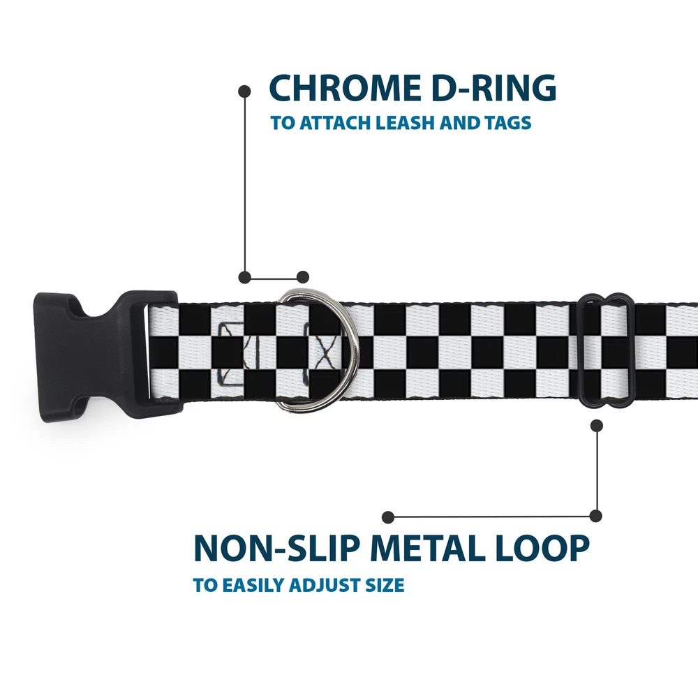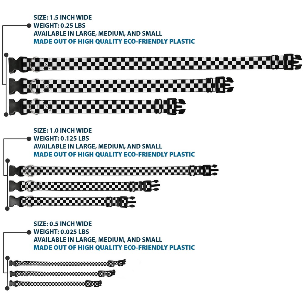 Further Details Title: Plastic Clip Collar Checker Black/White NARROW-Large 9.5-14.5" Condition: New Release Date: 03/16/2017 Description: Vibrant and bold, this beautiful, polyester dog collar is made to show off your dog's unique style through all the seasons. With an overengineered plastic buckle and strong D-ring, this durable collar can hold up to whatever your dog can dish out. This product is officially licensed by Buckle-Down. Item Height: 25mm Item Width: 12mm Item Weight: 15g Age Level: All Life Stages Brand: Buckle-Down Designs Color: Black Item Length: 381mm Material: Nylon Number of Items: 322 Type: Dog Collar Plastic Clip Buckle Dimensions: 15 x 0.5 x 1 inches; 0.53 ounces Pattern: Checker,Dog Size: 1/2" Wide - Fits 9.5-14.5" Neck - Large Closure: Buckle MPN: W20304-0.5-L Dog Breed: All Breed Sizes Fits 9.5-14.5" neck size and is 1/2 inch wide. Vibrant and bold, this beautiful polyester dog collar is made to show off your dog's unique style through all the seasons. With an overengineered plastic buckle and strong D-ring, this durable collar can hold up to whatever your dog can dish out. This product is assembled in the USA by Buckle-Down and is officially licensed by Checkered. Matching leads/leashes available Missing Information? Please contact us if any details are missing and where possible we will add the information to our listing.
