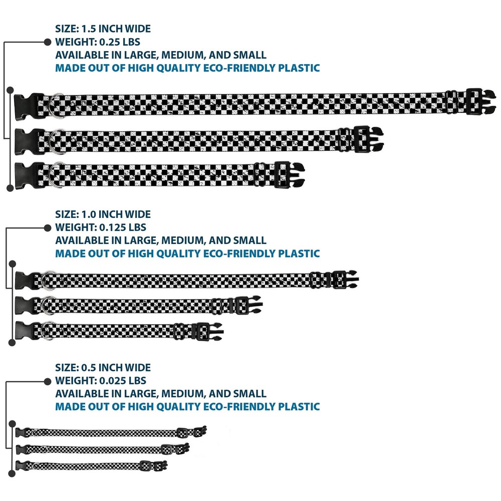 Further Details Title: Plastic Clip Collar Checker Weathered Black/White NARROW-Small 7-8.5" Condition: New Release Date: 03/16/2017 Description: Vibrant and bold, this beautiful, polyester dog collar is made to show off your dog's unique style through all the seasons. With an overengineered plastic buckle and strong D-ring, this durable collar can hold up to whatever your dog can dish out. This product is officially licensed by Buckle-Down. Item Height: 25mm Item Width: 12mm Item Weight: 17g Age Level: All Life Stages Brand: Buckle-Down Designs Color: Black Item Length: 228mm Material: Nylon Number of Items: 2523 Type: Dog Collar Plastic Clip Buckle Dimensions: 9 x 0.5 x 1 inches; 0.6 ounces Size: 1/2" Wide - Fits 7-8.5" Neck - Small Closure: Buckle MPN: W30318-0.5-S Dog Breed: All Breed Sizes Fits 7-8.5" neck size and is 1/2 inch wide. Vibrant and bold, this beautiful polyester dog collar is made to show off your dog's unique style through all the seasons. With an overengineered plastic buckle and strong D-ring, this durable collar can hold up to whatever your dog can dish out. This product is assembled in the USA by Buckle-Down and is officially licensed by Checkered. Matching leads/leashes available Missing Information? Please contact us if any details are missing and where possible we will add the information to our listing.