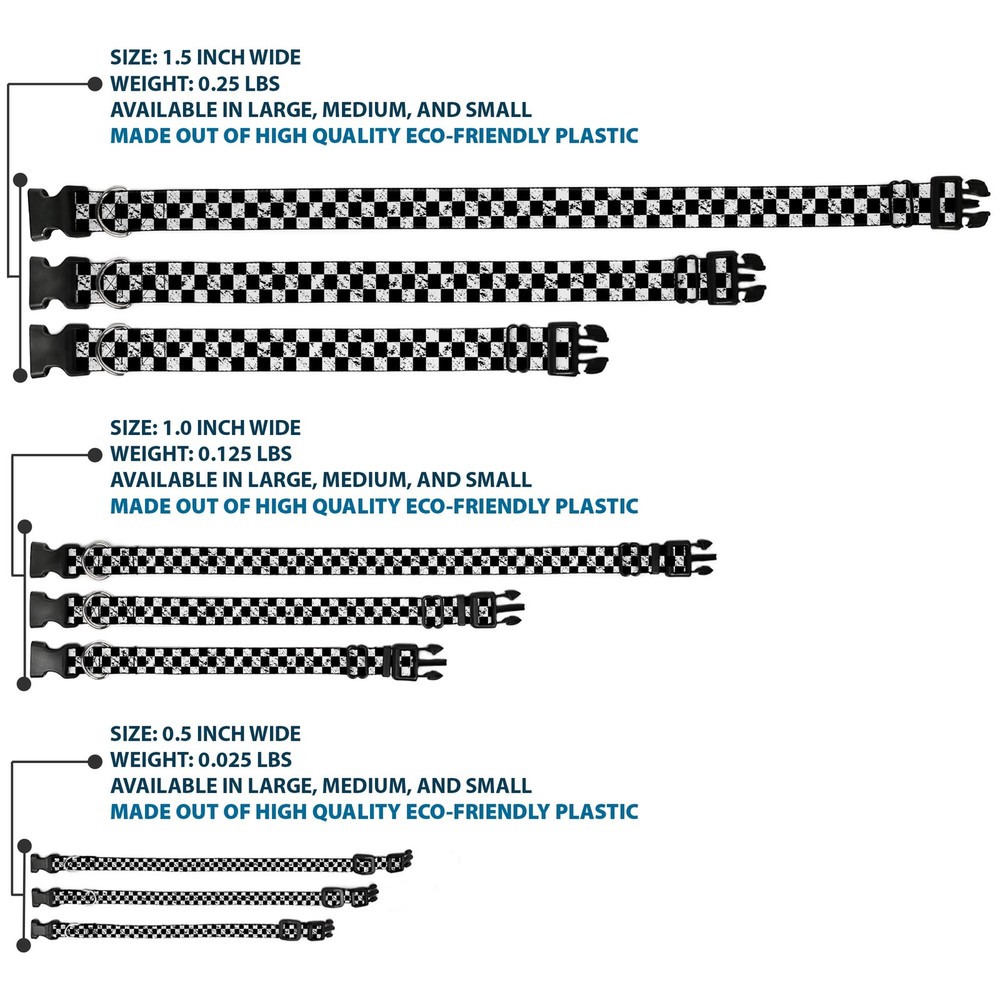 Further Details Title: Plastic Clip Collar Checker Weathered2 Black/White WIDE-Large 20-31" Condition: New Release Date: 03/16/2017 Item Weight: 85g Item Height: 25mm Age Level: All Life Stages Brand: Buckle-Down Designs MPN: W32994-1.5-L Item Length: 812mm Size: 1.5" Wide - Fits 20-31" Neck - Large Number of Items: 15748 Type: Dog Collar Plastic Clip Buckle Material: Nylon Dimensions: 32 x 1.5 x 1 inches; 3 ounces Closure: Buckle Item Width: 38mm Color: Black Description: Vibrant and bold, this beautiful, polyester dog collar is made to show off your dog's unique style through all the seasons. With an overengineered plastic buckle and strong D-ring, this durable collar can hold up to whatever your dog can dish out. This product is officially licensed by Buckle-Down. Dog Breed: All Breed Sizes Fits 20-31" neck size and is 1.5" wide. Vibrant and bold, this beautiful polyester dog collar is made to show off your dog's unique style through all the seasons. With an overengineered plastic buckle and strong D-ring, this durable collar can hold up to whatever your dog can dish out. This product is assembled in the USA by Buckle-Down and is officially licensed by Buckle-Down. Matching leads/leashes available Missing Information? Please contact us if any details are missing and where possible we will add the information to our listing.