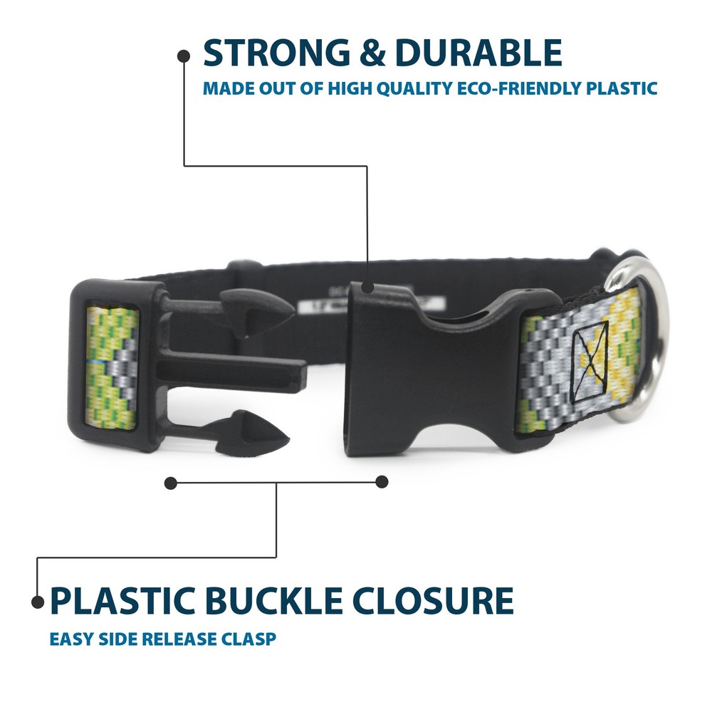 Further Details Title: Plastic Clip Collar Chevron Weave Grays/Yellow/Green NARROW-Large 9.5-14.5" Condition: New Release Date: 03/16/2017 Description: Vibrant and bold, this beautiful, polyester dog collar is made to show off your dog's unique style through all the seasons. With an overengineered plastic buckle and strong D-ring, this durable collar can hold up to whatever your dog can dish out. This product is officially licensed by Buckle-Down. Item Height: 25mm Item Width: 12mm Item Weight: 17g Age Level: All Life Stages Brand: Buckle-Down Designs Color: Multicolor Item Length: 381mm Material: Nylon Number of Items: 15085 Type: Dog Collar Plastic Clip Buckle Dimensions: 15 x 0.5 x 1 inches; 0.6 ounces Pattern: Chevron,Dog Size: 1/2" Wide - Fits 9.5-14.5" Neck - Large Closure: Buckle MPN: W32919-0.5-L Dog Breed: All Breed Sizes Fits 9.5-14.5" neck size and is 1/2 inch wide. Vibrant and bold, this beautiful polyester dog collar is made to show off your dog's unique style through all the seasons. With an overengineered plastic buckle and strong D-ring, this durable collar can hold up to whatever your dog can dish out. This product is assembled in the USA by Buckle-Down and is officially licensed by Buckle-Down. Matching leads/leashes available Missing Information? Please contact us if any details are missing and where possible we will add the information to our listing.