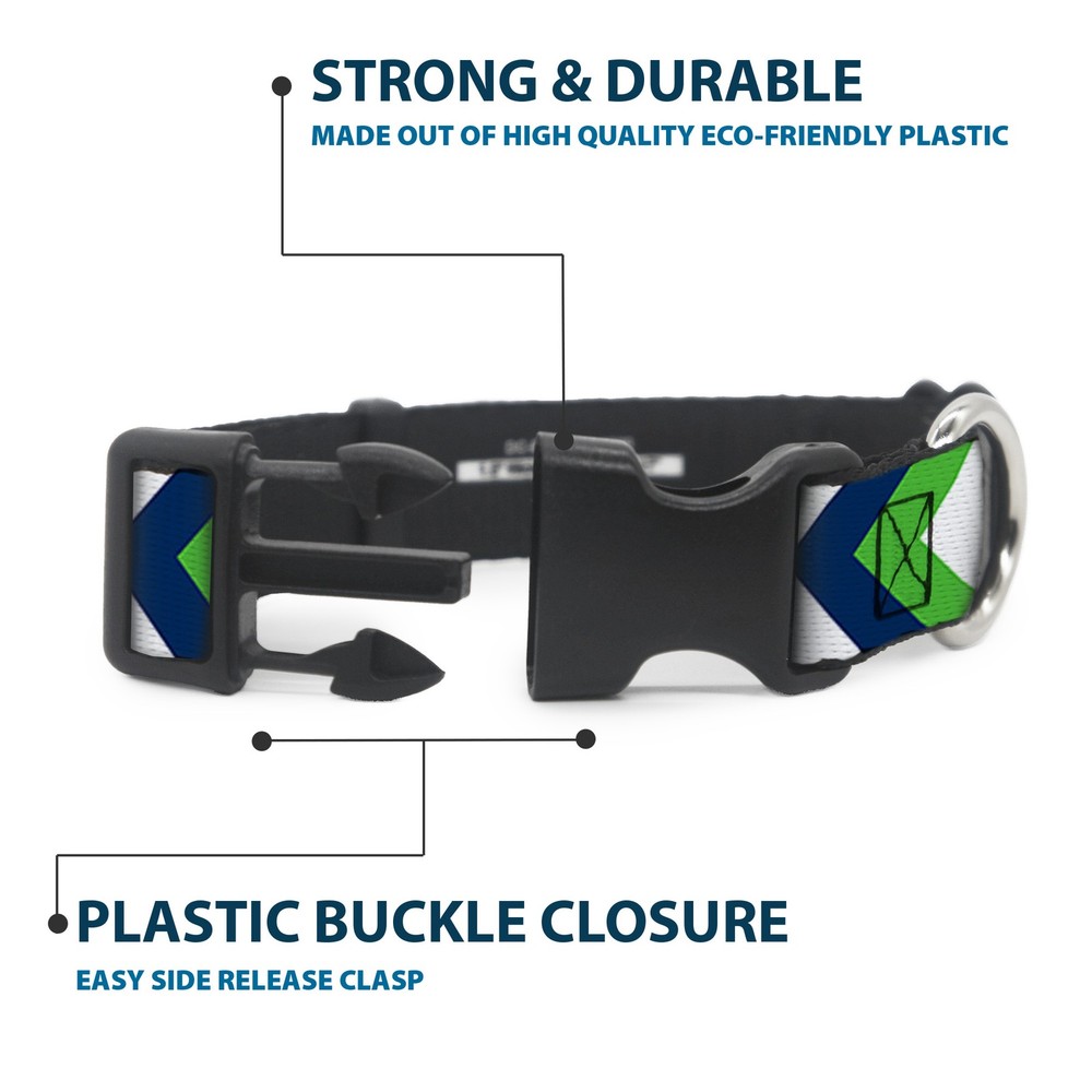 Further Details Title: Plastic Clip Collar Chevron White/Bright Green/Navy NARROW-Large 9.5-14.5" Condition: New Release Date: 03/16/2017 Description: Vibrant and bold, this beautiful, polyester dog collar is made to show off your dog's unique style through all the seasons. With an overengineered plastic buckle and strong D-ring, this durable collar can hold up to whatever your dog can dish out. This product is officially licensed by Buckle-Down. Item Height: 25mm Item Width: 12mm Item Weight: 17g Age Level: All Life Stages Brand: Buckle-Down Designs Color: Multicolor Item Length: 381mm Material: Nylon Number of Items: 19702 Type: Dog Collar Plastic Clip Buckle Dimensions: 15 x 0.5 x 1 inches; 0.6 ounces Size: 1/2" Wide - Fits 9.5-14.5" Neck - Large Closure: Buckle MPN: W35557-0.5-L Dog Breed: All Breed Sizes Fits 9.5-14.5" neck size and is 1/2 inch wide. Vibrant and bold, this beautiful polyester dog collar is made to show off your dog's unique style through all the seasons. With an overengineered plastic buckle and strong D-ring, this durable collar can hold up to whatever your dog can dish out. This product is assembled in the USA by Buckle-Down and is officially licensed by Buckle-Down. Matching leads/leashes available Missing Information? Please contact us if any details are missing and where possible we will add the information to our listing.