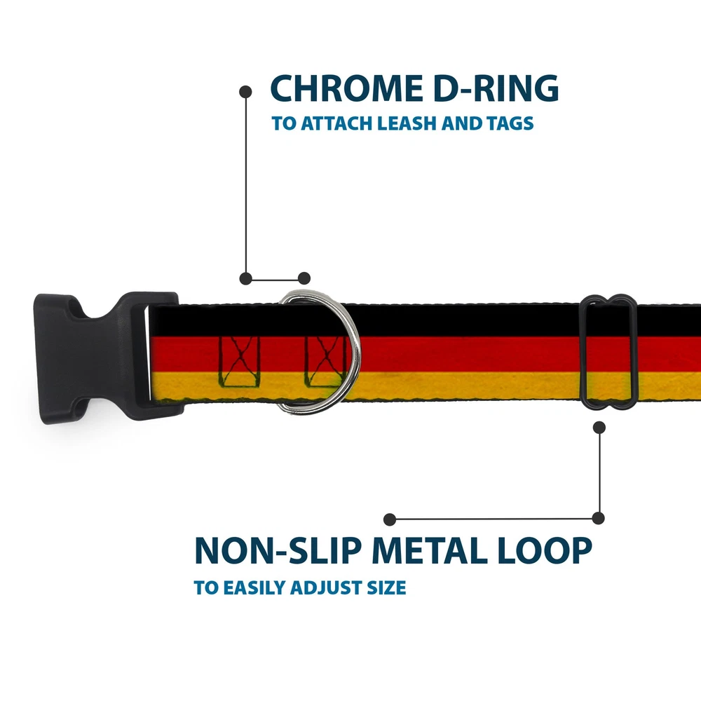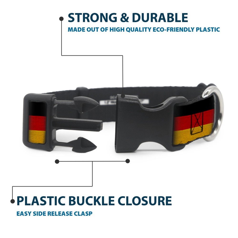 Further Details Title: Plastic Clip Collar Germany Flag Weathered Small 9.5-13" Condition: New Description: Vibrant and bold, this beautiful, polyester dog collar is made to show off your dog's unique style through all the seasons. With an overengineered plastic buckle and strong D-ring, this durable collar can hold up to whatever your dog can dish out. This product is officially licensed by Buckle-Down. Age Level: All Life Stages Brand: Buckle-Down Designs Color: Multicolor Closure: Buckle MPN: W30776-1.0-S Item Weight: 65g Material: Nylon Dimensions: 15 x 1 x 1 inches; 2.3 ounces Dog Breed: All Breed Sizes Item Length: 381mm Item Width: 25mm Item Height: 25mm Size: 1" Wide - Fits 9.5-13" Neck - Small Number of Items: 5569 Type: Dog Collar Plastic Clip Buckle Pattern: Dog Release Date: 03/16/2017 Fits 9.5-13" neck size and is 1" wide. Vibrant and bold, this beautiful polyester dog collar is made to show off your dog's unique style through all the seasons. With an overengineered plastic buckle and strong D-ring, this durable collar can hold up to whatever your dog can dish out. This product is assembled in the USA by Buckle-Down and is officially licensed by Germany. Matching leads/leashes available Missing Information? Please contact us if any details are missing and where possible we will add the information to our listing.