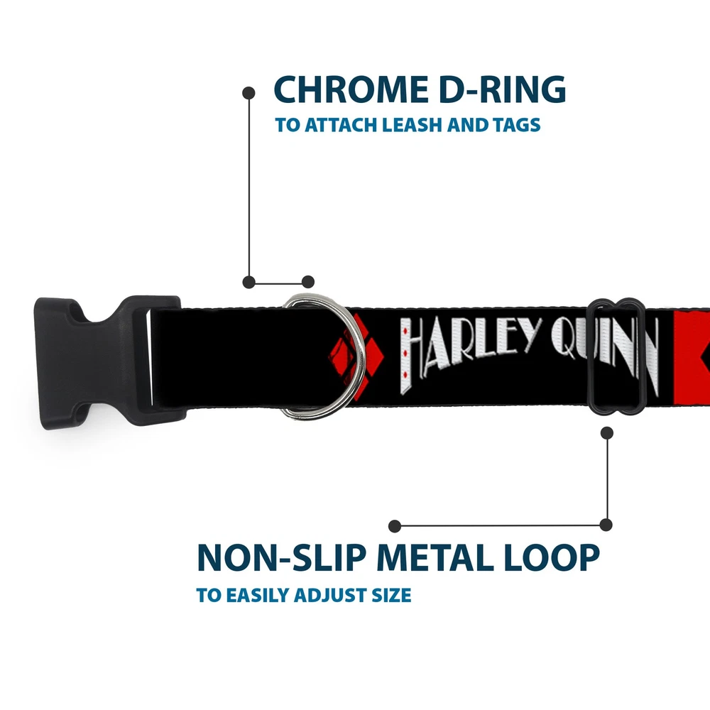 Further Details Title: Plastic Clip Collar HARLEY QUINN/Diamonds Black/Red/White WIDE-Medium 16-23" Condition: New Description: Vibrant and bold, this beautiful, polyester dog collar is made to show off your dog's unique style through all the seasons. With an overengineered plastic buckle and strong D-ring, this durable collar can hold up to whatever your dog can dish out. This product is officially licensed by DC Comics. Age Level: All Life Stages Brand: Harley Quinn Color: Red Closure: Buckle MPN: WJK007-1.5-M Item Weight: 81g Material: Nylon Dimensions: 23 x 1.5 x 1 inches; 2.88 ounces Dog Breed: All Breed Sizes Item Length: 584mm Item Width: 38mm Item Height: 25mm Size: 1.5" Wide - Fits 16-23" Neck - Medium Number of Items: 50605 Type: Dog Collar Plastic Clip Buckle Pattern: Dog Release Date: 03/16/2017 Fits 16-23" neck size and is 1.5" wide. Vibrant and bold, this beautiful polyester dog collar is made to show off your dog's unique style through all the seasons. With an overengineered plastic buckle and strong D-ring, this durable collar can hold up to whatever your dog can dish out. This product is assembled in the USA by Buckle-Down and is officially licensed by DC Comics. Matching leads/leashes available Missing Information? Please contact us if any details are missing and where possible we will add the information to our listing.