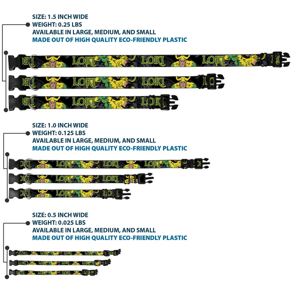 Further Details Title: Plastic Clip Collar LOKI in Action Black/Gray/Yellow/Green Large 15-24" Condition: New Release Date: 03/19/2019 Item Weight: 60g Item Height: 25mm Age Level: All Life Stages Brand: Marvel Comics MPN: WAV028-1.0-L Item Length: 660mm Size: 1" Wide - Fits 15-24" Neck - Large Number of Items: 44984 Type: Dog Collar Plastic Clip Buckle Material: Polyester Pattern: Dog Dimensions: 26 x 1 x 1 inches; 2.12 ounces Item Width: 25mm Description: Vibrant and bold, this beautiful, polyester dog collar is made to show off your dog's unique style through all the seasons. With an overengineered plastic buckle and strong D-ring, this durable collar can hold up to whatever your dog can dish out. This product is officially licensed by Marvel Comics. Color: Yellow Dog Breed: All Breed Sizes Closure: Buckle Fits 15-24" neck size and is 1" wide. Vibrant and bold, this beautiful polyester dog collar is made to show off your dog's unique style through all the seasons. With an overengineered plastic buckle and strong D-ring, this durable collar can hold up to whatever your dog can dish out. This product is assembled in the USA by Buckle-Down and is officially licensed by Marvel Comics. Matching leads/leashes available. Missing Information? Please contact us if any details are missing and where possible we will add the information to our listing.