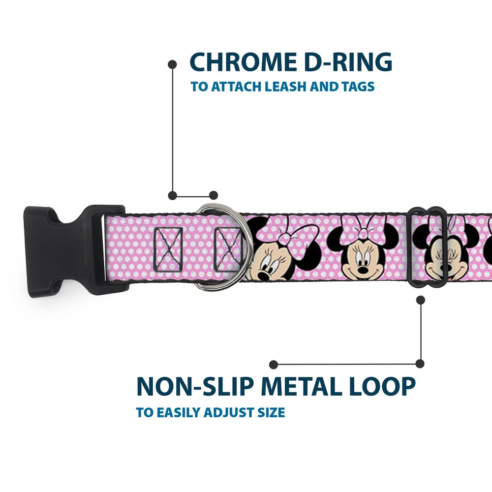 Further Details Title: Plastic Clip Collar Minnie Mouse Expressions Polka Dot Pink/White WIDE-Medium 16-23" Condition: New Release Date: 09/28/2016 Item Weight: 81g Item Height: 25mm Age Level: All Life Stages Brand: Mickey and Friends MPN: WDY093-1.5-M Item Length: 584mm Size: 1.5" Wide - Fits 16-23" Neck - Medium Number of Items: 38643 Type: Dog Collar Plastic Clip Buckle Material: Nylon Pattern: Dog Dimensions: 23 x 1.5 x 1 inches; 2.88 ounces Item Width: 38mm Color: Pink Description: Vibrant and bold, this beautiful, polyester dog collar is made to show off your dog's unique style through all the seasons. With an overengineered plastic buckle and strong D-ring, this durable collar can hold up to whatever your dog can dish out. This product is officially licensed by Disney. Closure: Buckle Dog Breed: All Breed Sizes Fits 16-23" neck size and is 1.5" wide. Vibrant and bold, this beautiful polyester dog collar is made to show off your dog's unique style through all the seasons. With an overengineered plastic buckle and strong D-ring, this durable collar can hold up to whatever your dog can dish out. This product is assembled in the USA by Buckle-Down and is officially licensed by Disney. Matching leads/leashes available Missing Information? Please contact us if any details are missing and where possible we will add the information to our listing.