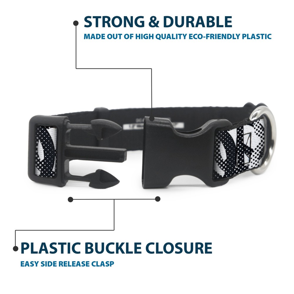 Further Details Title: Plastic Clip Collar Peace Dots White/Black Medium 11-16.5" Condition: New Release Date: 03/16/2017 Item Weight: 65g Item Height: 25mm Age Level: ‎All Life Stages Brand: Buckle-Down Designs MPN: W31612-1.0-M Item Length: 431mm Size: 1" Wide - Fits 11-16.5" Neck - Medium Number of Items: ‎9633 Type: Dog Collar Plastic Clip Buckle Material: Nylon Dimensions: 17 x 1 x 1 inches; 2.3 ounces Closure: Buckle Item Width: 25mm Color: Black Description: Vibrant and bold, this beautiful, polyester dog collar is made to show off your dog's unique style through all the seasons. With an overengineered plastic buckle and strong D-ring, this durable collar can hold up to whatever your dog can dish out. This product is officially licensed by Buckle-Down. Dog Breed: ‎All Breed Sizes Fits 11-16.5" neck size and is 1" wide. Vibrant and bold, this beautiful polyester dog collar is made to show off your dog's unique style through all the seasons. With an overengineered plastic buckle and strong D-ring, this durable collar can hold up to whatever your dog can dish out. This product is assembled in the USA by Buckle-Down and is officially licensed by Peace. Matching leads/leashes available Missing Information? Please contact us if any details are missing and where possible we will add the information to our listing.