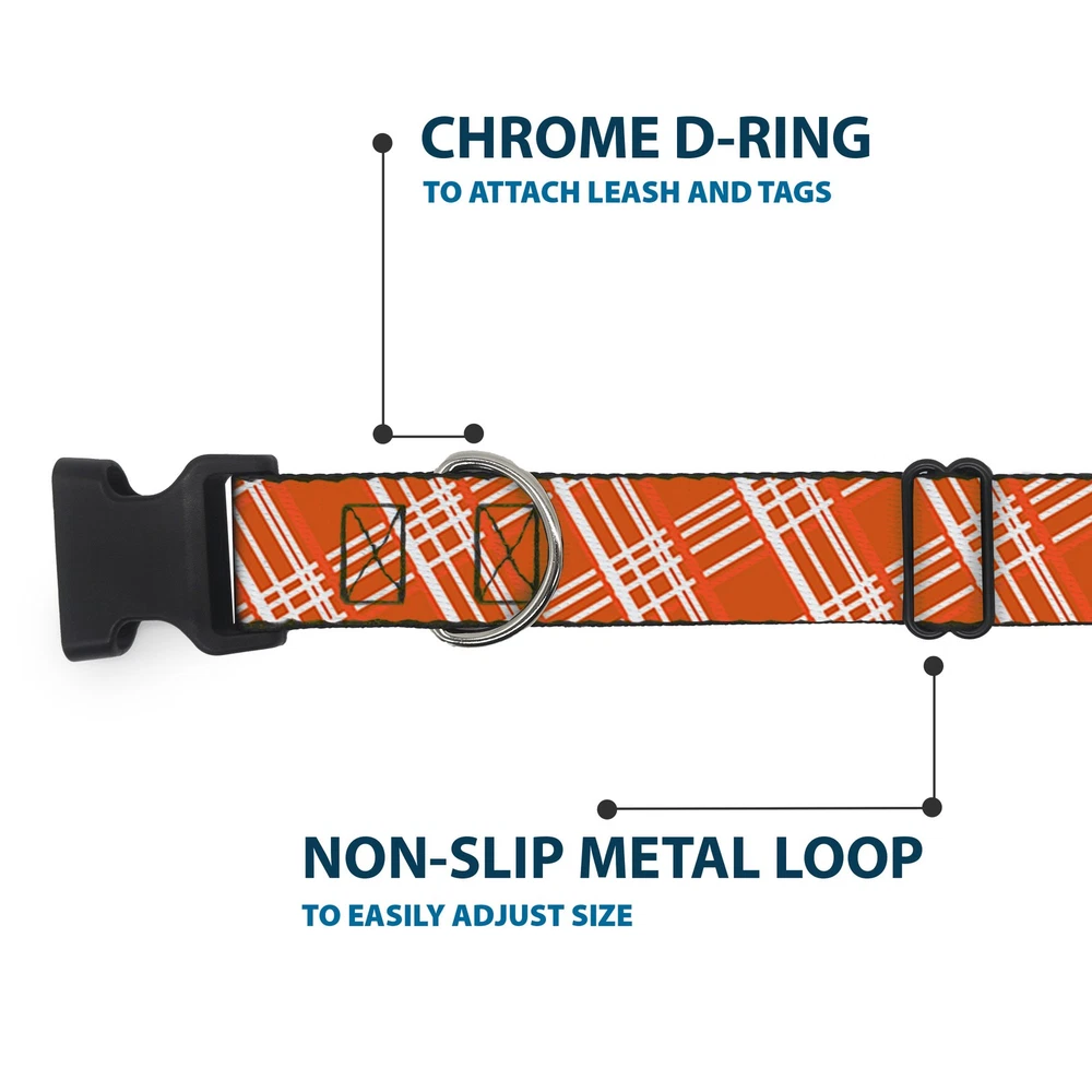 Further Details Title: Plastic Clip Collar Plaid X4 Oranges/White Small 9.5-13" Condition: New Release Date: 03/16/2017 Description: Vibrant and bold, this beautiful, polyester dog collar is made to show off your dog's unique style through all the seasons. With an overengineered plastic buckle and strong D-ring, this durable collar can hold up to whatever your dog can dish out. This product is officially licensed by Buckle-Down. Item Height: 25mm Item Width: 25mm Item Weight: 65g Age Level: All Life Stages Brand: Buckle-Down Designs Color: Orange Item Length: 381mm Material: Nylon Number of Items: 17862 Type: Dog Collar Plastic Clip Buckle Dimensions: 15 x 1 x 1 inches; 2.3 ounces Pattern: Dog,Plaid Size: 1" Wide - Fits 9.5-13" Neck - Small Closure: Buckle MPN: W34277-1.0-S Dog Breed: All Breed Sizes Fits 9.5-13" neck size and is 1" wide. Vibrant and bold, this beautiful polyester dog collar is made to show off your dog's unique style through all the seasons. With an overengineered plastic buckle and strong D-ring, this durable collar can hold up to whatever your dog can dish out. This product is assembled in the USA by Buckle-Down and is officially licensed by Buckle-Down. Matching leads/leashes available Missing Information? Please contact us if any details are missing and where possible we will add the information to our listing.