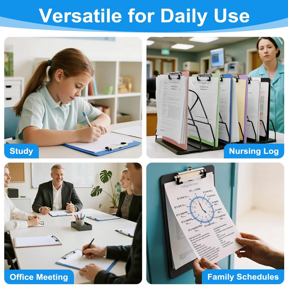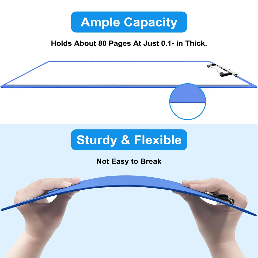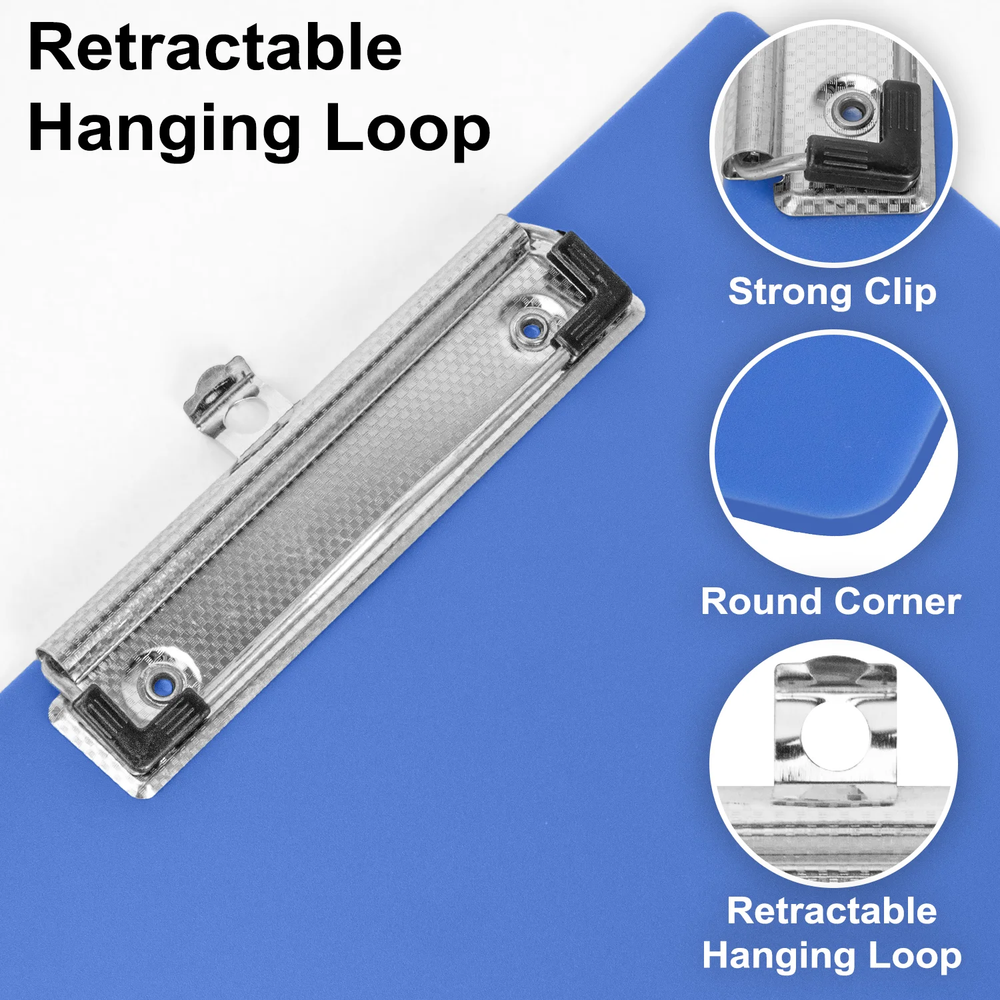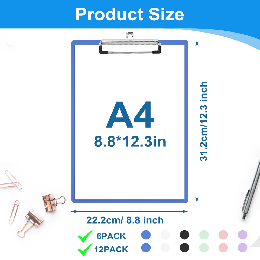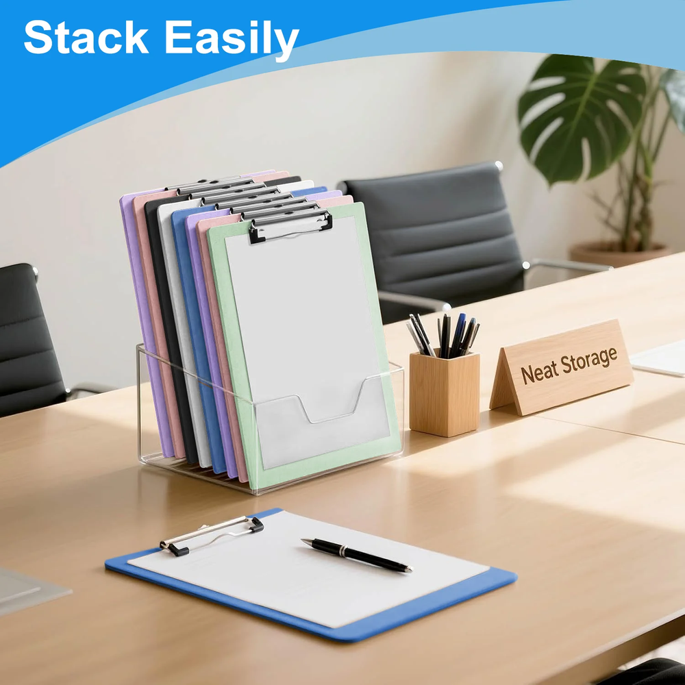 Efficient Organization, Delivered in Color. Streamline your workflow with the XUEYU Clipboard 6-Pack. This set is engineered for performance, offering a secure hold for up to 100 sheets, a durable and lightweight frame, and a low-profile clip for easy stacking. The included hanging loop and variety of colors make it the smart choice for any busy environment. ✔Specifications: Material: Plastic Colors: Black, White, Blue, Lavender, Pink, Mint Green Paper Capacity: Up to 100 Sheets Paper Size: A4 / Letter Clip Type: Low-Profile Jumbo Clip Features: Stackable Design, Retractable Hanging Loop, Rounded Corners Set Includes: 6 Clipboards 【Holds Up to 100 Sheets Securely】The high-capacity clip on your XUEYU clipboard firmly grips up to 100 sheets of A4 or Letter-size paper, ensuring your documents stay in place. This streamlined design maintains a firm hold without sacrificing a low profile. 【Colorful 6-Pack with 6 Colors】Combine efficiency with style! This set of six clipboards—in Black, White, Blue, Lavender, Pink, and Mint Green—lets you create a visual organization system. Assign colors to projects, subjects, or priorities to streamline your workflow in the office or classroom, making organization intuitive and enjoyable. 【Organize Every Space Efficiently】From the classroom to the office and beyond, this XUEYU 6-pack is the essential tool for organization everywhere. Perfect for professionals, students, and families alike, use these clipboards to manage presentations, coordinate group activities, or simply keep household paperwork in check. 【Built to Last, Designed to Carry】Discover the perfect harmony of resilience and convenience. Engineered for resilience, XUEYU clipboards withstand the rigors of daily use with a chip and crack-resistant design. Their lightweight construction ensures easy transport, providing a firm, reliable writing surface wherever you need it—making every task hassle-free. 【Effortlessly Stackable & Hangable】Engineered for efficient storage and display. The low-profile jumbo clip enables secure stacking to save space. Additionally, the integrated retractable hanging loop offers flexible vertical organization for classrooms, offices, or home use.