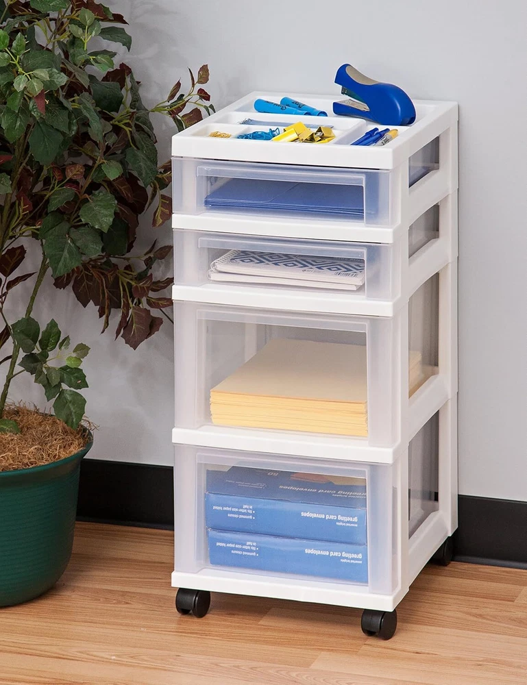 MULTI-PURPOSE ORAGNIZER: Store a variety of household items that are frequently used in the office, closet, under-desk, kid’s room, craft room, nursery, or dorm room MOBILE STORAGE SOLUTION: Removable wheels are included, can be attached to the foot of the chest so you can move it around smoothly, or remove them for secured placement MADE IN USA: High-quality materials are used for our domestically-manufactured products. The sturdy plastic makes these durable, and the smooth glide drawers give you easy access to contents. We use recyclable material, so our products are green-circle certified. Drawers : Drawer stops are attached on both sides of drawers to prevent drawers from falling out. Drawer dimensions: 12.5”D X 9.5”W X 2.94”H (Shallow) / 6.75”H (Deep). DIMENSION: 14.25"D X 12.05"W X 25.94"H Product information Color White Material Plastic Frame Material Plastic Product Dimensions 14.25"D x 12.05"W x 26.4"H Number of Drawers 4 Item Weight 6.4 Pounds Assembly Required No UPC 762016490496 Global Trade Identification Number 00762016490496 Item Weight 6.44 pounds