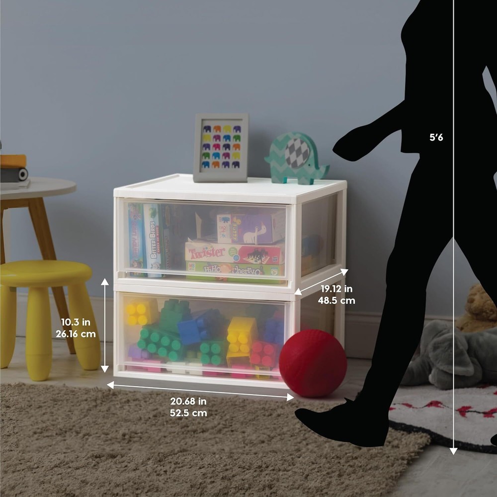 MADE IN USA with global materials - The plastic stacking drawers offer a practical storage solution for any room in your home. Keep small, similar things together or use them for storing frequently used and replenished items such as snacks, vitamins and medicine, stationery, craft supplies, and more. PERFECT ORGANIZER - Use the sliding drawer to get your closet, bathroom, craft room, or that needs organizing in order. The drawer allows for easy access to stored items in the kitchen, helps create a storage solution for your craft room, or use it in a nursery to store diapers, onesies, bottles, and whatever else you need. MULTI-FUNCTIONAL - Keep your frequently used items within reach by storing them in the IRIS USA plastic stacking drawer. The clear material of the drawer make it easy to check what's inside, while the coral frame provides some privacy and makes it easier to store items in a way that's not distracting. STACKABLE - The stackable design allows you to create your own unique storage solution, either by stacking multiple to create your own tabletop storage cabinet or by spreading them out amongst any rooms that require more storage space. The choice is yours. GREAT SIZE: Dimensions: 19.13"L x 20.69"W x 10.31"H (17.38"D x 17.75"W x 8.50"H) Product information Color White Material Plastic Special Feature Stackable Style Modern Recommended Uses For Product For storage Product Dimensions 19.1"L x 20.7"W x 10.3"H Capacity 47 Quarts Item Weight 4 Pounds Opening Mechanism Lift-Off Lid Shape Rectangular Pattern Drawer Number of Items 2 Number of Compartments 2 Unit Count 2.0 Count Item Package Quantity 1 Material Feature BPA Free Occasion general household storage UPC 762016491592 Global Trade Identification Number 00762016491592 Item Weight 4 pounds