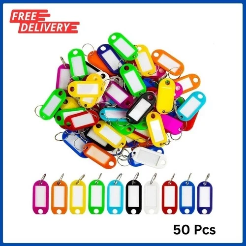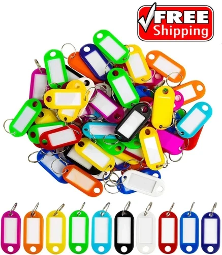 BRAND NEW 【10 Bright Colors】Each package comes with 50 pack key tags in 10 bright colors (including blue, white, rose red, red, orange, black, green, purple, yellow, sky blue), 5 pieces of each color. Various colors are great for identifying different keys for different locks without taking up much room 【Convenient Design】Each key tag contains blank paper for labeling, convenient for you to write markings. And the transparent window design allows you to see the mark at a glance. The split rings make it easy for you to connect them to items. Very lightweight, easy to carry, which will not cause you any additional burden 【Easy to Use】Our plastic keychain label tag is easy to use. We suggest that you remove the keyring first, then remove the label and protective film, mark it and wait for the ink to dry completely to avoid smearing, then install the label and protective film, finally place the keyring back on 【Wide Application】These key id label tags are made of premium plastic material, durable and sturdy, not easily fading. They are great as name tags on keys, lunchboxes, backpacks, luggage, suitcases, USB flash drives, or anything else that needs an ID. Your good helper in organizing messy keys 【Wide Application】These key id label tags are made of premium plastic material, durable and sturdy, not easily fading. They are great as name tags on keys, lunchboxes, backpacks, luggage, suitcases, USB flash drives, or anything else that needs an ID. Your good helper in organizing messy keys THANK YOU