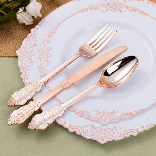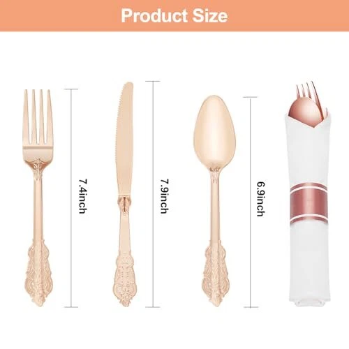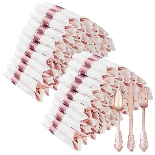 Return Policy Fast Delivery Trusted seller 100 Pack Rose Gold Plastic Silverware with Pre Rolled Napkins for 100 Guests, Heavyweight Rose Gold Disposable Utensils Sets Includes 300 Plastic Cutlery, and 100 Napkins for Christmas Product Description EXQUISITE DESIGN: These rose gold plastic utensils are beautifully designed in a vintage style with beautifully engraved handles, pursuing the perfect combination of detail and texture. The rose gold plastic silverware is perfect for placing on your dining table, adding a touch of luxury to your dining experience. PREMIUM QUALITY: The rose gold plastic cutlery is made from 100% food grade, BPA free, easy to cleanup, definitely worth the budget. Moreover, these disposable utensils are constructed with heavy duty plastic, enhancing their strength and durability, making them resistant to breakage during use. PERFECT FOR ANY OCCASION: These rose gold plastic silverware sets are suitable for wedding decorations, parties, dinners, get-togethers, birthdays, engagements, Valentine's Day, Christmas and other special anniversaries. Nothing adds sparkle to your party better than these disposable rose gold plastic cutlery. PACKAGING COMPONENTS: Our 300 pieces rose gold plastic silverware includes 100 plastic knives, 100 forks and 100 spoons, suitable for serving up to 100 guests. In addition, plastic cutlery set with 100 napkins suitable for weddings and parties, adding a touch of detail and perfection to your dining occasion. CONVINENT DISPOSABLE OR REUSABLE: The disposable rose gold plastic cutlery is perfect for parties and other occasions. They can be discarded after single use. However, they are constructed of heavy duty materials that can be washed with water then reused, and the addition of napkins enhances their usefulness. Shipping Returns Payment Shipping Shipping is FREE to all addresses other than APO/PO boxes in the lower 48 states. All our stock ships from US-based warehouses. Shipped via USPS or UPS (depending on location and package weight) Unless stated otherwise, all orders will ship within 24-72 hours of your payment being processed. Check our feedback to see the great reviews of FAST shipping we offer. Returns Seller does not accept returns Payment We currently accept payment via eBay managed payments only. Once payment is cleared, we will dispatch your shipment within 1-3 business days. Please refer to the "Shipping" tab for more information regarding shipping speed to your destination.