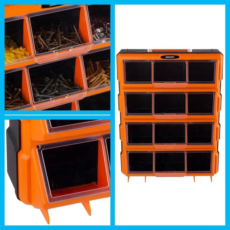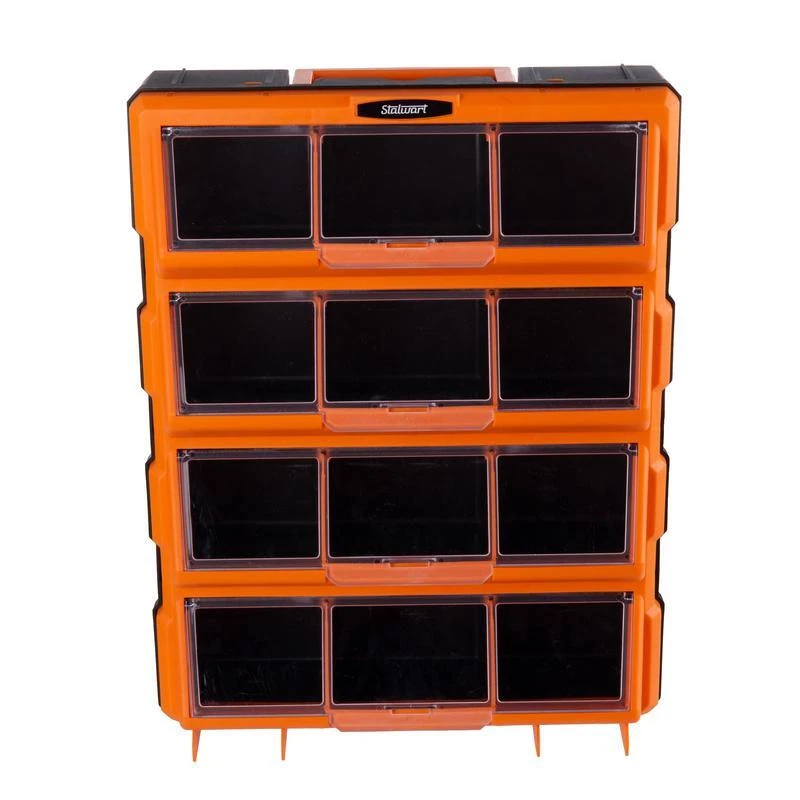 You may also like Simple Design Computer Writing Desk W/ Shelves Durable Compact Easy Assembly New 36.11 USD 38.01 USD Free shipping 5% off Eco-Friendly Computer Desk W/ CPU Shelf Two Drawer Storage Home Office Portable 39.01 USD 41.06 USD Free shipping 5% off Folding Bar Stools Set of 2 Heavy-Duty Indoor Compact Chairs W/ Padded Seats New 47.45 USD 49.95 USD Free shipping 5% off Retro Wooden Toy Chest Storage Bench Safety Hinges Easy Access Organizer Greige 69.48 USD 73.14 USD Free shipping 5% off 90°/180°rotatable Extension Pole Cordless Pole Saw 3.87-6.72 Foot Telescoping US 75.99 USD 79.99 USD Free shipping 5% off Cast Aluminum 10-In Fry Pan Nonstick Dishwasher Oven Safe Kitchen Essential New 27.94 USD 29.41 USD Free shipping 5% off 3 Pcs Black Jewelry Bust Display Stand Necklace Holder Mannequin Organizer New 39.88 USD 41.98 USD Free shipping 5% off Three-Light Indoor Island Pulley Pendant Vintage Industrial Metal Fixture New 164.48 USD 173.14 USD Free shipping 5% off Digital 2-Slice Toaster Touch Display Defrost Bagel High-Lift Easy Eject Kitchen 36.45 USD 38.37 USD Free shipping 5% off Airtight Kitchen Food Storage Containers 8 Pack Easy Lock Lids Organization Set 32.29 USD 33.99 USD Free shipping 5% off Solar LED Path Lights 20 Lumen Outdoor Landscape Lighting Eco-Friendly 2-Pack US 24.85 USD 26.16 USD Free shipping 5% off Ice Maker Assembly Kit IM116000 Refrigerators Appliance Repair Genuine Parts New 87.23 USD 91.82 USD Free shipping 5% off The Plastic Storage Bins with Drawers by Stalwart is an excellent organizational solution for your garage, craft room, playroom, or office. This stackable tabletop screw organizer can also be mounted to the wall with the built-in keyhole slots on the rear and has a handle on top to easily take it on the go, offering easy access to the 12 bins wherever you need them. SMALL PARTS ORGANIZER - The Stalwart storage organizer with drawers provides the perfect way to sort and store everything from screws, nuts, bolts, or fishing gear, to crafting materials and toys. SMART DESIGN - This garage storage solution features 12 bins with clear tops that give full visibility to the contents inside, and lids that flip open to give easy access to the contents. STRONG CONSTRUCTION - The plastic drawers organizer is constructed from impact-resistant material that is built to last, whether you use it in your workshop, craft room, or a kids playroom. SECURE STORAGE - The plastic storage bins with drawers can be placed on any work surface, stacked, mounted to the wall using the keyhole slots on the back, or taken on the go thanks to the top handle. DIMENSIONS - Overall Craft Organizer: (L) 18. 5" x (W) 14. 25" x (H) 5. 12”. COLOR - Black and Orange. You may also like Simple Design Computer Writing Desk W/ Shelves Durable Compact Easy Assembly New 36.11 USD 38.01 USD Free shipping 5% off Eco-Friendly Computer Desk W/ CPU Shelf Two Drawer Storage Home Office Portable 39.01 USD 41.06 USD Free shipping 5% off Machine Washable Non Slip Kitchen Rugs Set Absorbent Floor Mats Entrance Hallway 74.44 USD 78.36 USD Free shipping 5% off Cordless Angle Grinder 18V Battery Powered Metal Tool Adjustable Handle Green 55.09 USD 57.99 USD Free shipping 5% off 73 Compartment Tool Storage Box Organizer W/ Trays Durable Plastic Structure New 26.27 USD 27.65 USD Free shipping 5% off Luxury Bath Sheet Set 2 Soft Absorbent Cotton Terry Towels Hotel Quality 35x66In 129.15 USD 135.95 USD Free shipping 5% off Wood Jewelry Display Riser Set 5pcs Hexagon Stand Rings Necklaces Earrings New 42.15 USD 44.37 USD Free shipping 5% off 3-In-1 Coat Rack Shoe Bench Organizer 9 Hooks Storage Industrial Easy Assembly 69.44 USD 73.09 USD Free shipping 5% off Pentero 29 Inch Tall Fireclay Pedestal Bathroom Sink Stand Modern Fixture New 75.05 USD 79.0 USD Free shipping 5% off Touchscreen 2-Slice Toaster Quick View Function 30 Sec Control Sleek Design New 51.16 USD 53.85 USD Free shipping 5% off Carbon Steel Non-Stick Stir Fry Pan/Wok Easy Clean Soft Handle Healthy Cooking 27.81 USD 29.27 USD Free shipping 5% off Stainless Steel 2-Slice Toaster LCD Countdown Defrost Reheat Bagel Functions New 67.01 USD 70.54 USD Free shipping 5% off