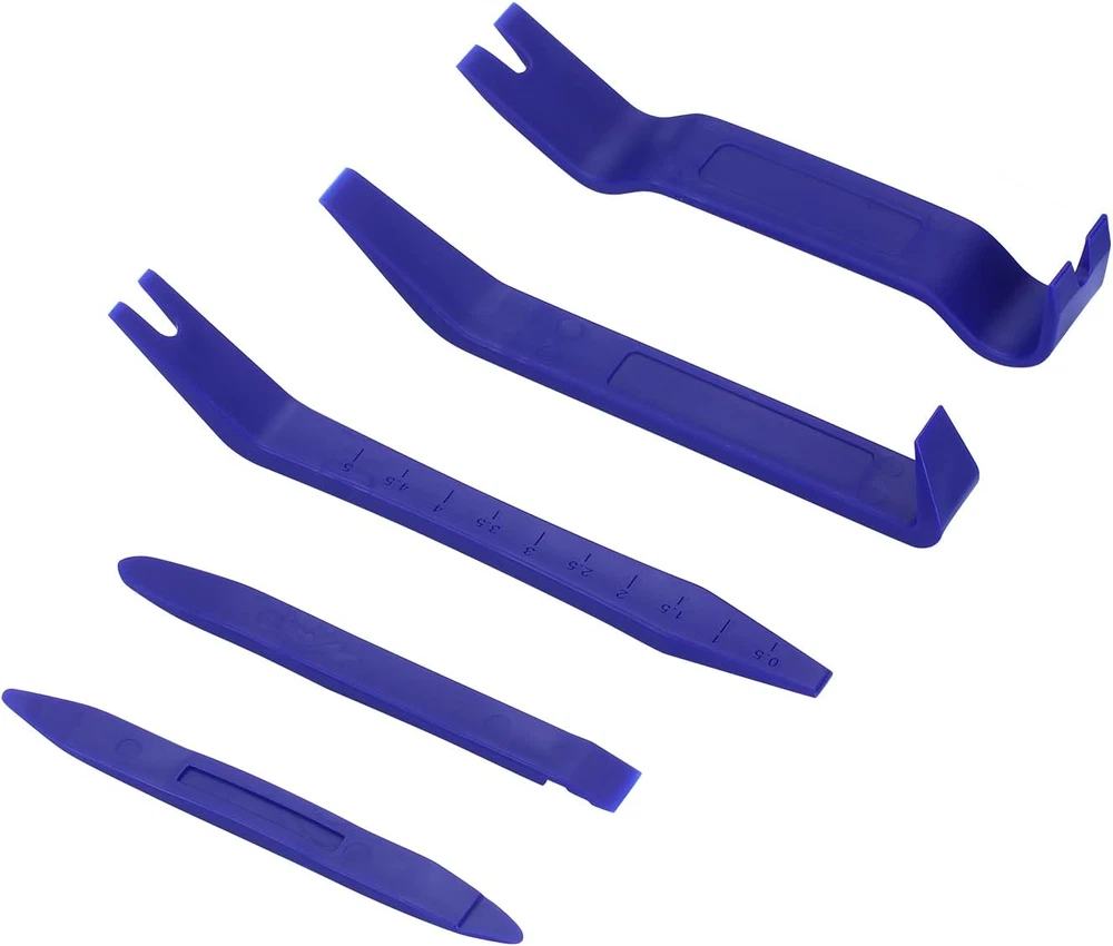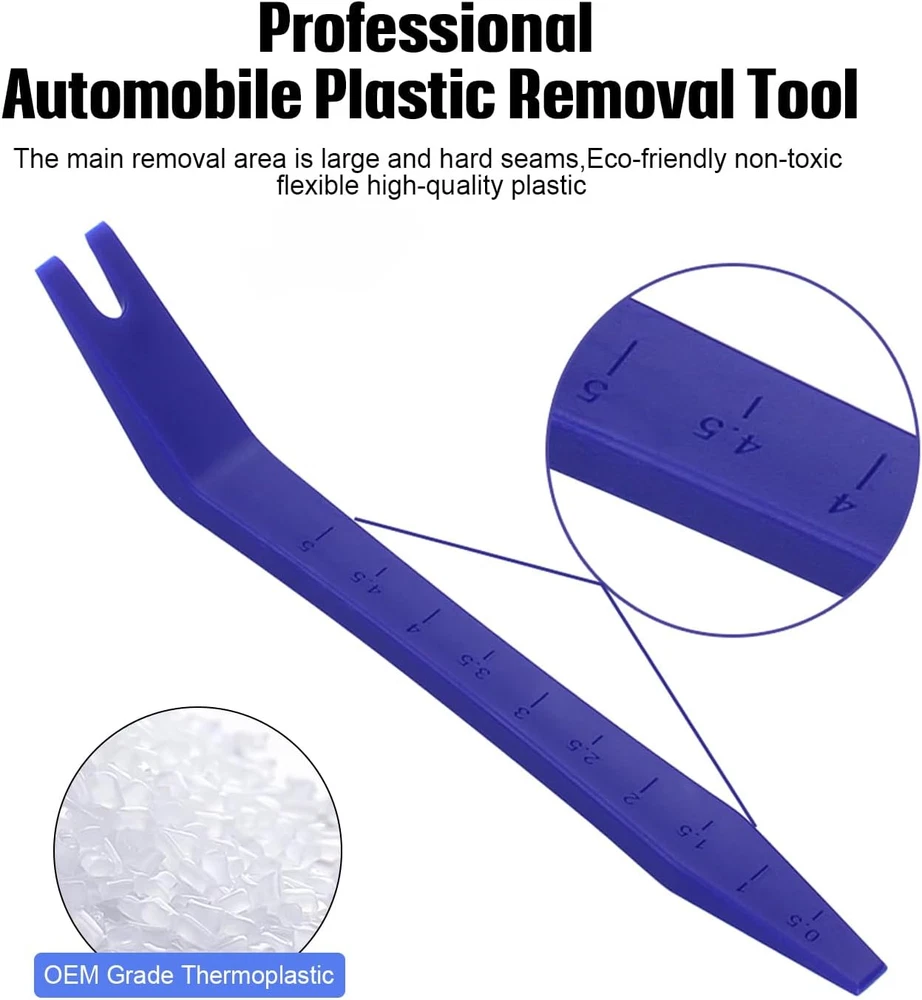 No Marring and No Scratch - The sharp and clean edge of the trim removal tool ensures the good effect of using and curved, Ultra-thin clip head can reach the confined areas without pry off the trim. Easily install or remove car accessories without damaging the car. ERGONOMIC DESIGN - The trim removal tool is ergonomic design with super lightweight and easy handheld features. The anti-slip and thick handle can prevent it from falling off from your hand when in use, allows you to use with less effort and improve efficiency. - HIGH QUALITY - Made of super durable plastic nylon material with high level craftsmanship, non-toxic and eco-friendly designed, sturdy enough for long-time usage. Super lightweight and portable, you can store anywhere or carry in your bag when you're not in use. - UNIVERSAL CAR PANEL DOOR TRIM REMOVAL SET - Suitable for disassembly and assembly of automotive or marine parts such as fasteners, door panels, vehicle dash radio, instrument panels, clips, moldings, base plates, etc. - PACKAGE INCLUDES - There are 5pcs different kinds of trim tools, perfect for professionals and beginners doing any care modifications. Buyer Note: If you are satisfied with our service, we appreciate you leaving us a positive feedback and 5 star rating review! Your opinion is important to the success of our business. If you are not satisfied with the product or have not received the product for more than 35 days, please contact us to resolve, we will do our best to solve. We are sure to come up with a satisfactory solution. Please contact us first before leaving cold feedback or good feedback of 1-3 stars and opening the case. We'll do our best to solve your problem. Because we believe that everything can be solved through communication. Thank you very much!