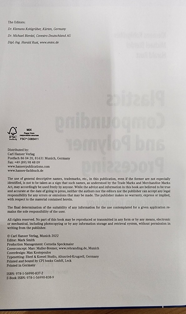 Plastics Compounding and Polymer Processing: Fundamentals, Machines, Equipment, Application Technology Elevate your knowledge of polymer processing with this definitive resource, authored by Klemens Kohlgrüber, Michael Bierdel, and Harald Rust . Whether you’re a seasoned plastics engineer, a researcher, or an industry professional, this book is an invaluable reference for mastering the intricacies of plastics compounding and polymer processing. Plastics production comprises the main process steps "synthesis (reaction)", "preparation/compounding" at the raw material manufacturer and compounder, and "processing" (shaping into semi-finished or finished products). In this handbook, the central middle step, preparation and compounding, is discussed. The preparation tasks include the removal of components, the incorporation of additives, and the change of particle size. Compounding is the incorporation of additives into a polymer or plastic. The process engineering fundamentals and the specific equipment and machines used are described. The specialist authors impart their knowledge from the fields of research, polymer production, and equipment/machine production with applications in plastics technology. Features: Comprehensive Coverage : Delves into the fundamentals of polymer science , advanced compounding methods, machine operations, and application technologies. Practical Insights : Includes in-depth discussions on machinery, equipment, and cutting-edge processing techniques. Real-World Applications : Perfect for solving practical challenges in the polymer and plastics industries. Condition: Excellent : Carefully maintained and in like-new condition, with no markings or wear. Ideal for collectors or professionals seeking a pristine copy. Product Details: Title : Plastics Compounding and Polymer Processing: Fundamentals, Machines, Equipment, Application Technology Authors : Klemens Kohlgrüber, Michael Bierdel, Harald Rust Binding : Hardcover Publisher : Renowned for high-quality technical publications Language : English Why This Book? This is the ultimate guide for anyone involved in plastics compounding and processing, offering a wealth of knowledge on the principles, machinery, and applications that drive the industry forward. Whether you're optimizing production or learning the fundamentals, this book is a cornerstone of polymer engineering literature. Shipping: Fast and reliable shipping with secure packaging to ensure the book arrives in excellent condition. Don’t miss this opportunity to own a must-have resource for plastics professionals and enthusiasts. Buy now!