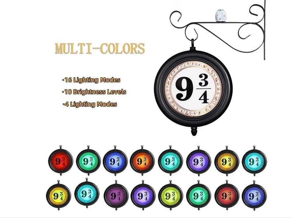【Perfect Gift for Fans】this wall night light mimics the 9¾ wall sign, You can give it to your friends or kids as a gift for holiday, birthday, Christmas, New Year, Halloween, etc. 【Various Lighting Effects】The room decor lamp has RGB 16 Colors and 4 Dynamic Lights-Flash, Strobe, Fade, and Smooth to create different atmospheres, You can use the remote control to adjust. In addition, It also provides a lighting effect memory function.Note: Please aim the remote control at the infrared receiver next to the charging port of the lamp and use it within a range of 2m. 【Upgraded Deco Wall Lights】Our decorative lights are made of 16 bright light beads,double-sided light, the lighting effect is more uniform and equipped with a magnetic owl lamp, this decorative lamp is larger in size, has clearer pattern printing suitable for fans of all magic schools. 【Save Electricity Design】Built-in 2500 mAh battery, Type-C charging, charging time only takes 4 hours, and you can use it wirelessly for 12-30 hours. Wireless Remote Control, More Convenient to use. Note: The protective film on the panel needs to be removed to get the brighter lighting effect. 【Easy installation】You will receive 1 Platform 9¾ Night Light, 1 bracket, 3 screws, 1 lighted owl decoration, 1 remote control, 1 USB Type-C cable and 1 manual.When installing, just use the provided expansion screw to install the bracket, then hang the night lamp.