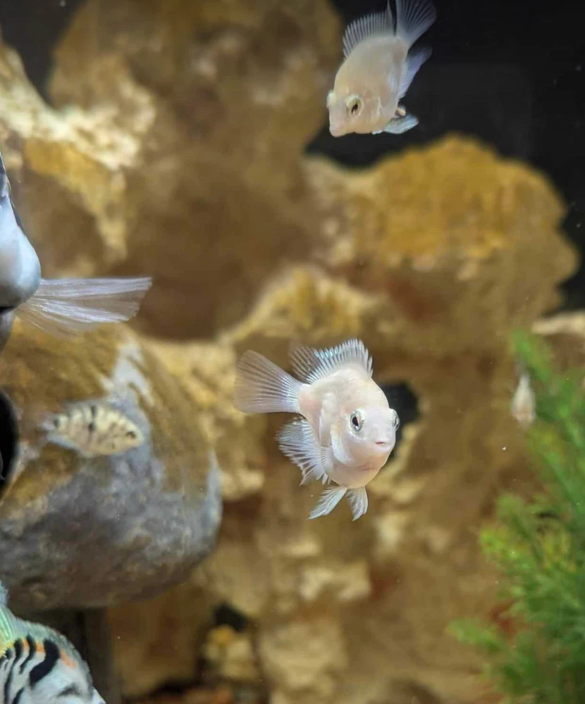 Introducing the Platinum Polar Parrot Cichlid , also known as the Snow White Cichlid a stunning addition to any freshwater aquarium. This CAN BE an aggressive species during mating season and is an intermediate level fish sold in a mixed gender lot from here in the United States. The Platinum Polar Parrot Cichlid finds tropical temperature waters to be the most relaxing and are known for their hardiness. The Cichlid is a fascinating creature that will bring a unique touch to your aquarium. In addition to its rarity, this fish is also known for its vibrant blue coloring and unique behavior patterns. It is perfect for fish and aquarium enthusiasts who enjoy a challenge. Don't miss out on the opportunity to add this amazing species to your collection.