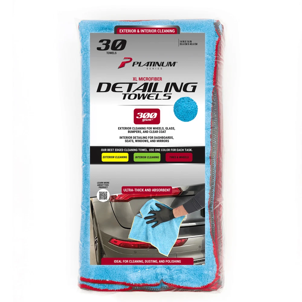 Platinum Series XL Multi-Purpose Microfiber Towels, 30 Pack are the primary choice for all auto and home day-to-day cleaning jobs. Durable, reusable, super absorbent 300 GSM cloths easily trap dirt, dust, and grime. Whether you cleaning and detailing your car, dusting furniture, or wiping down your kitchen counters, these lint free towels work perfectly on all surfaces. The extra large size of 14" X 17" covers more surface area and have multi-colored edges to help designate use. Platinum Series XL Cleaning Towels may be used wet or dry, are lint-free, scratch-free, and non-abrasive making them a safe and effective surface cleaner. For a deep clean, pair up with your favorite cleaning solution, wax, or spray. The fabric effortlessly absorbs water from all surface types immediately without leaving lint or streaks behind, making them the perfect for glass cleaning. (30) Extra large 14" x 16" multi-purpose microfiber towels, ideal for interior and exterior auto and home cleaning Super absorbent towels that will not leave behind lint or streaks and clean simply with water Durable, machine washable and reusable cleaning cloths safe on all surfaces such as glass, clear coat, metal, leather, vinyl and more Multi-colored edges to help designate use and avoid cross contamination