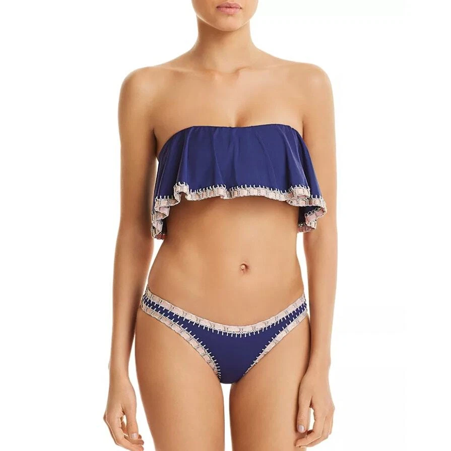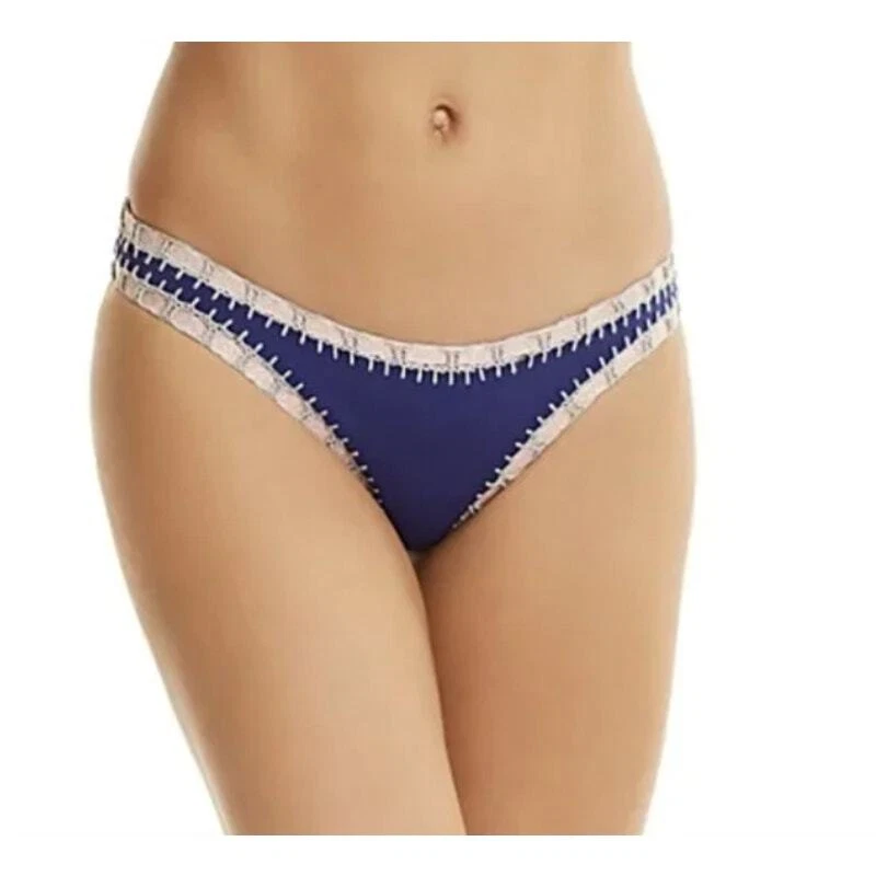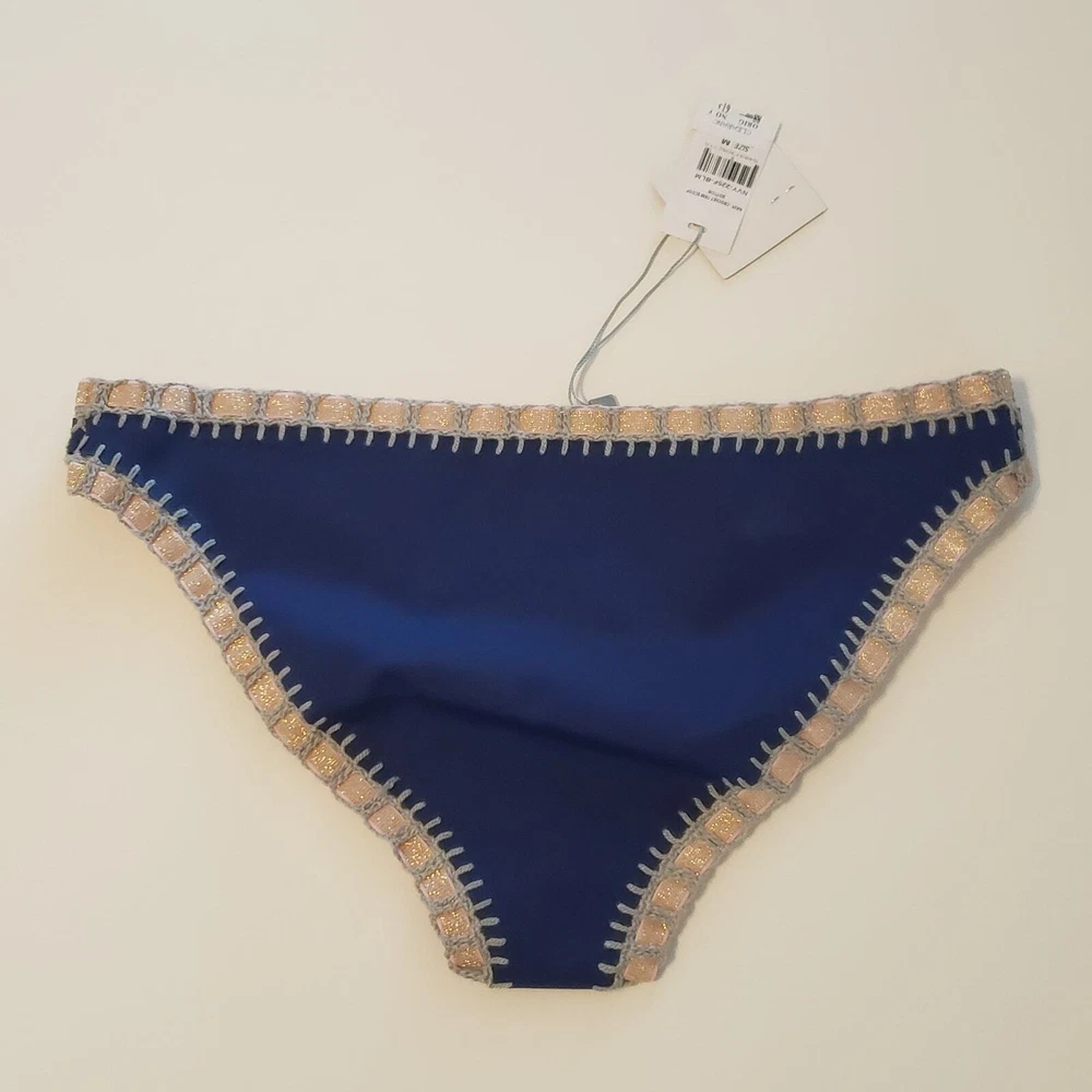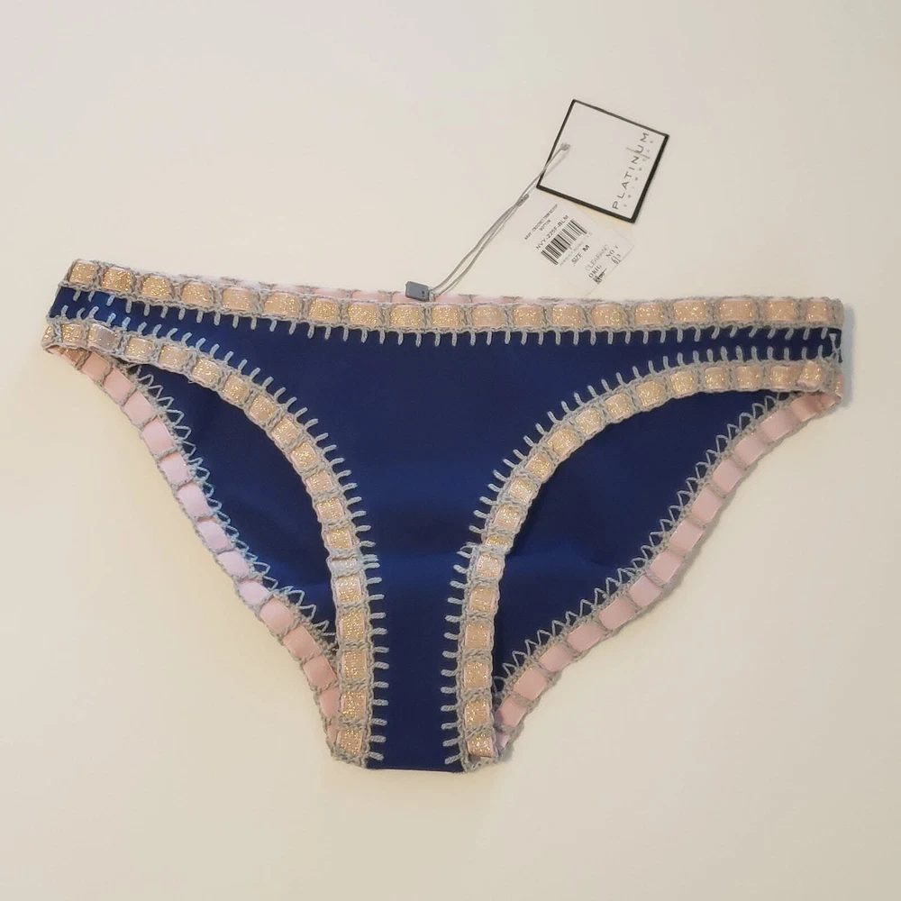 Platinum Swimwear Crochet Trim Scoop Bikini Swim Bottom Navy Blue Pull-on style Moderate coverage Contrast metallic banded trim with whipstitched detail Bottom only Nylon Spandex Hand wash cold Size M Medium Approximate Measurements: waistband - 14.5 length - 8.5 New with tags, no flaws. I have lots of swim pieces, and accessories. Please take a look and bundle. Smoke free, dog friendly home. summer beach trendy island travel vacation vaca bohemian coastal swim crisp breezy effortless resort cruise