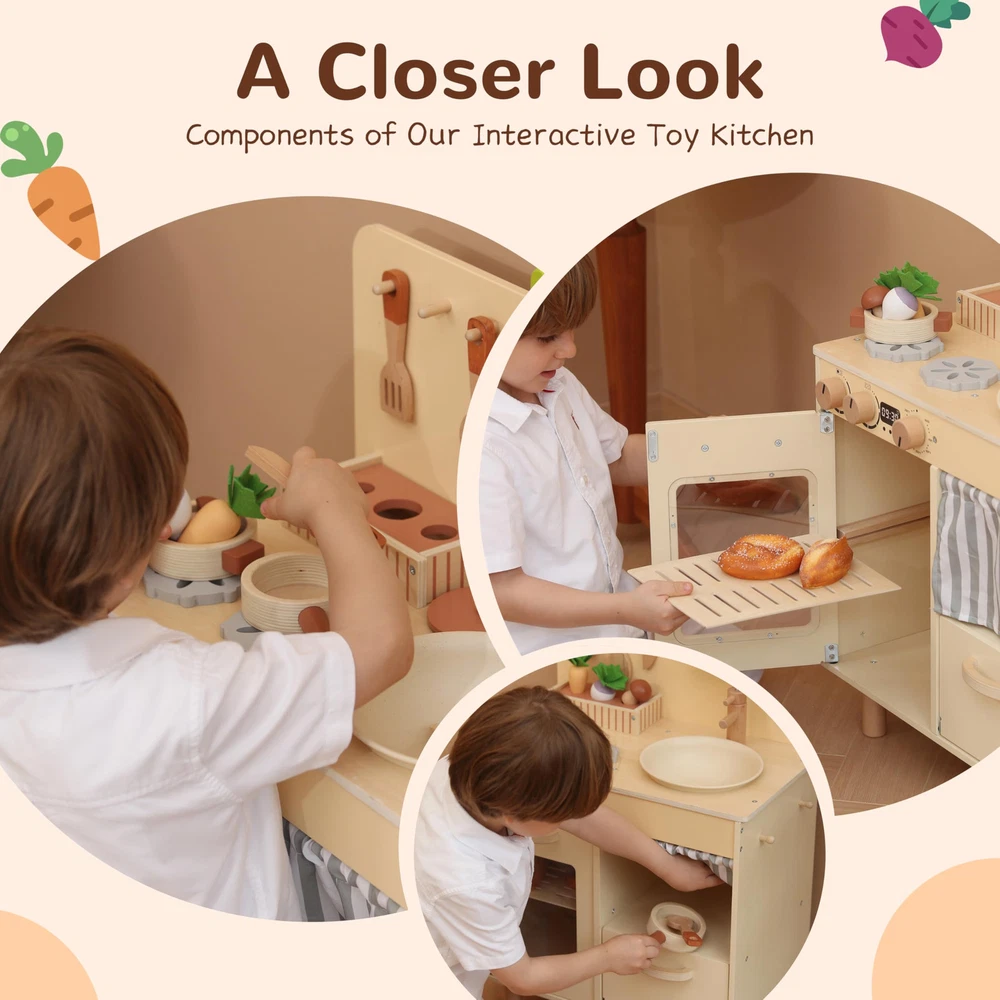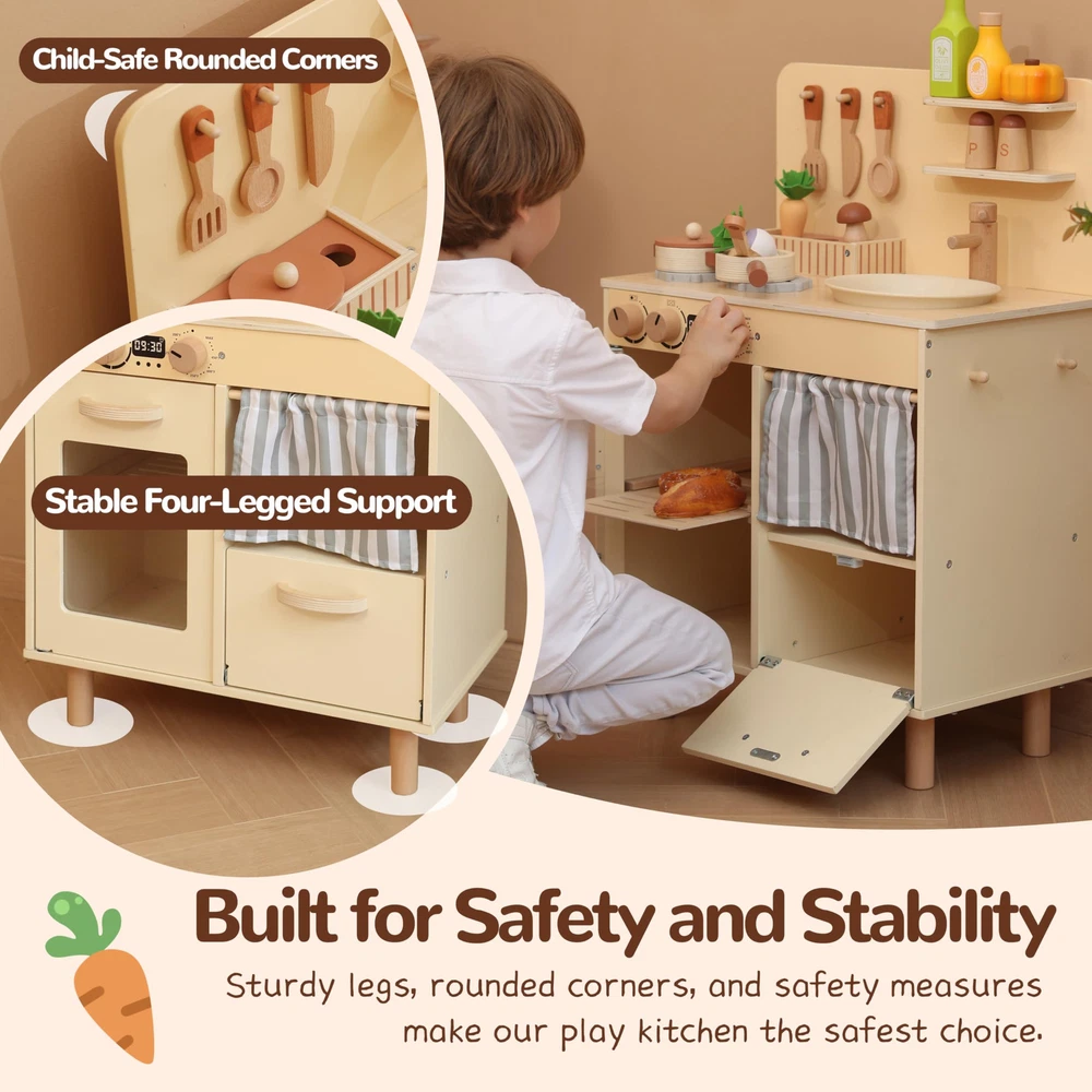 Explore Culinary Creativity: This play kitchen set features turning knobs, swivel faucet, and an array of realistic kitchen tools that mimic real-life kitchen functions. A durable and engaging play experience awaits—ideal for fostering independence and lifelong learning Modern Home-Style Storage Play Kitchen: Crafted to complement contemporary home decor while meeting children's needs for toy storage, our play kitchen stands out with its unique design. Beyond offering endless entertainment, it incorporates clever storage solutions that teach children how to categorize and maintain an organized space,fostering independence and tidy habits. Parent and Friend Collaborative Play: Our play kitchen is designed to enhance social interactions, encouraging both parents and their children's friends to join in the fun. This inclusive setup allows children to learn from parents while sharing the joy of cooking with their peers, fostering a cooperative environment. It's an ideal space for teaching teamwork, sharing responsibilities, and enhancing communication skills, all while creating cherished memories together Compact Design with Easy Assembly: Our small play kitchen is perfect for limited spaces, offering all the fun of a full-sized kitchen set in a compact, streamlined design. It's specifically crafted to fit comfortably in smaller rooms or apartments without sacrificing play value. Assembly is a breeze, with clear instructions and minimal parts to ensure that you can have the kitchen ready for playtime quickly and effortlessly High-Quality, Safe Materials: Our kitchen set is designed to be safe for children and withstand the rigors of enthusiastic play. The design includes features appropriately sized for small hands, with no sharp edges, ensuring a safe environment where your little ones can freely explore and learn