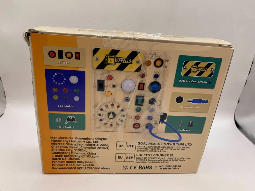 This high quality wood toy introduces your child to developing their STEM learning skills. They will learn to understand cause and effect, hand eye coordination, color matching, improve their focus and improve their fine motor skills through sensory activities. They will enjoy pushing, pressing and inserting activities that result in lights, acceleration, and results that occur because of something we did. This toy features smooth edges and corners for safety, and has a handle for easy transport.
