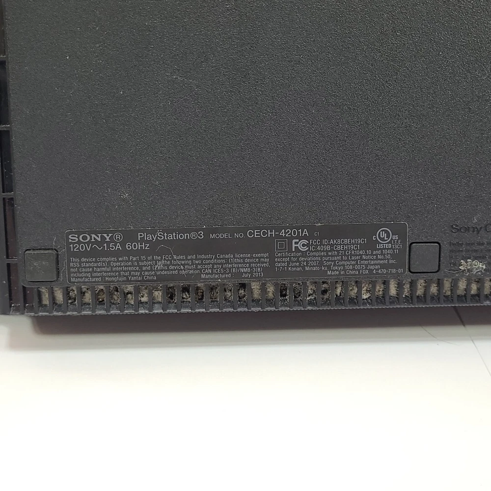 Platform:Sony PlayStation 3Region Code:NTSCBrand:SonyStorage Capacity:12 GBType:ConsoleModel:Sony PlayStation 3 - Super SlimConnectivity:HDMIColor:BlackCountry/Region of Manufacture:ChinaMPN:CECH-4201aFeatures:Internet Browsing
