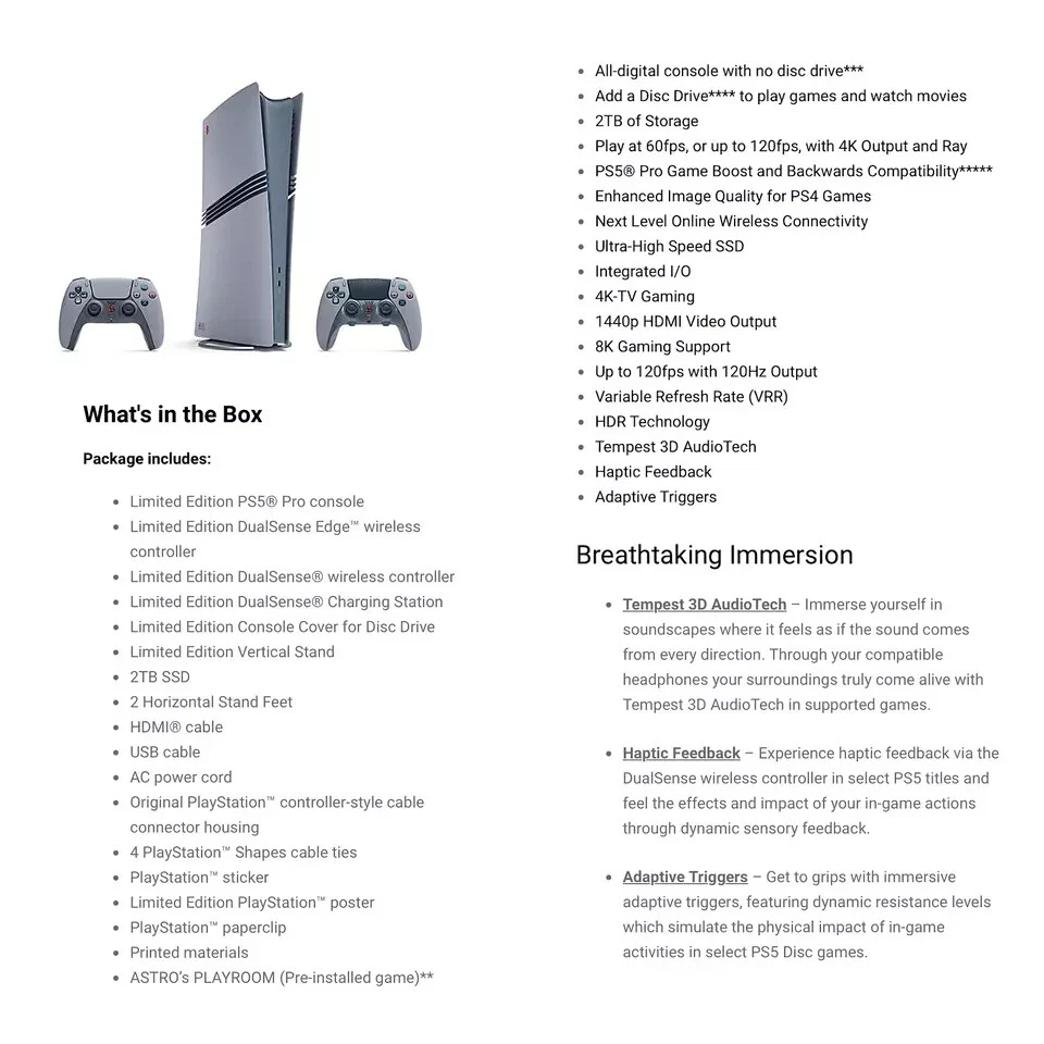 Get the sealed bundle + an added physical Disc drive to play games you already own (and buy games on sales not offered for digital) It will ship out TODAY if you order before 2pm EST . If it's after that time, we will ship it first thing tomorrow. Disc drive is in addition to the bundle! BUNDLE INCLUDES: Limited Edition PS5® Pro console Limited Edition DualSense Edge™ wireless controller Limited Edition DualSense® wireless controller Limited Edition DualSense® Charging Station Limited Edition Console Cover for Disc Drive Limited Edition Vertical Stand 2TB SSD 2 Horizontal Stand Feet HDMI® cable USB cable AC power cord Original PlayStation™ controller-style cable connector housing 4 PlayStation™ Shapes cable ties PlayStation™ sticker Limited Edition PlayStation™ poster PlayStation™ paperclip Printed materials ASTRO’s PLAYROOM (Pre-installed game)**
