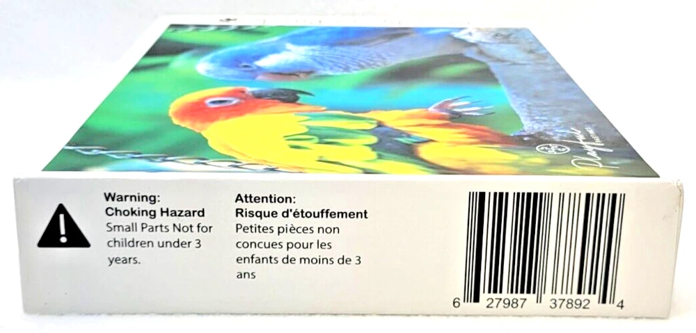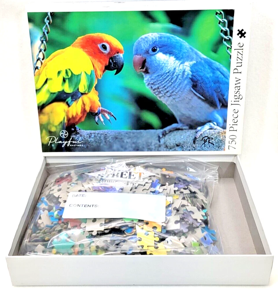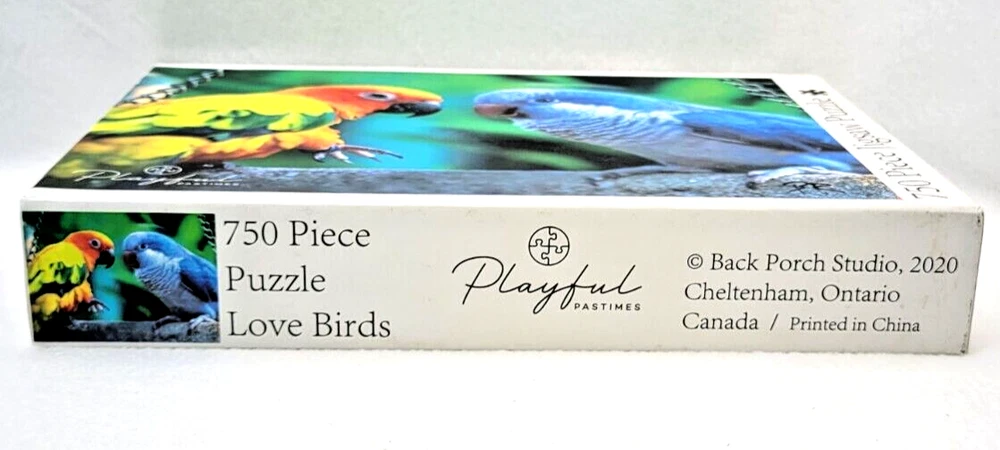 This Playful Pastimes Love Birds Jigsaw Puzzle features 750 pieces of vibrant, multi-colored birds perched on a branch. Measuring 27 inches by 20 inches when completed, it offers a fun challenge for ages 8 and up. The cardboard pieces have an anti-glare matte finish for easy viewing and are interlocking for a secure fit. This puzzle comes from a smoke-free household and is perfect for bird lovers and puzzle enthusiasts alike. Its theme and design make it a great addition to any puzzle collection. Get ready to spend hours piecing together this beautiful image of love birds in their natural habitat -- Being together. Doing puzzles has some hidden benefits . Excellent qualities : Cultivate concentration, patience, and temper your will Movement development : Train hand-eye coordination and precise small movements Spatial intelligence : Improve visual discrimination of colors and shapes Critical thinking ability : Understand the relationship between parts and the whole, and draw inferences from one example to explore the future Relaxes your mind : Relieve work pressure and release yourself Brain development : Enhance memory and may help prevent or slow brain degeneration We did not work the puzzle or count the pieces, but we verify the number count at your request. Each item we ship is carefully packaged to prevent any damage and is shipped immediately with tracking.