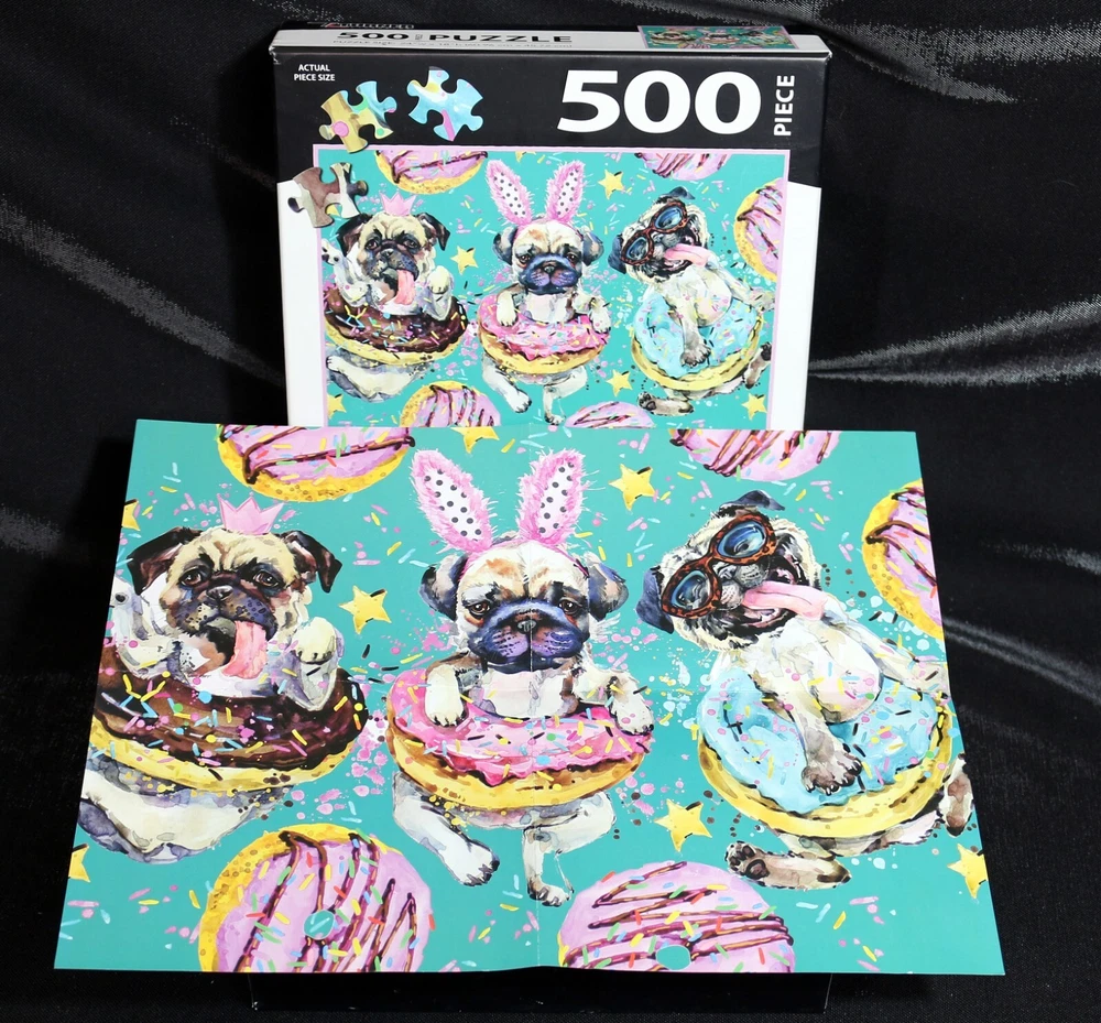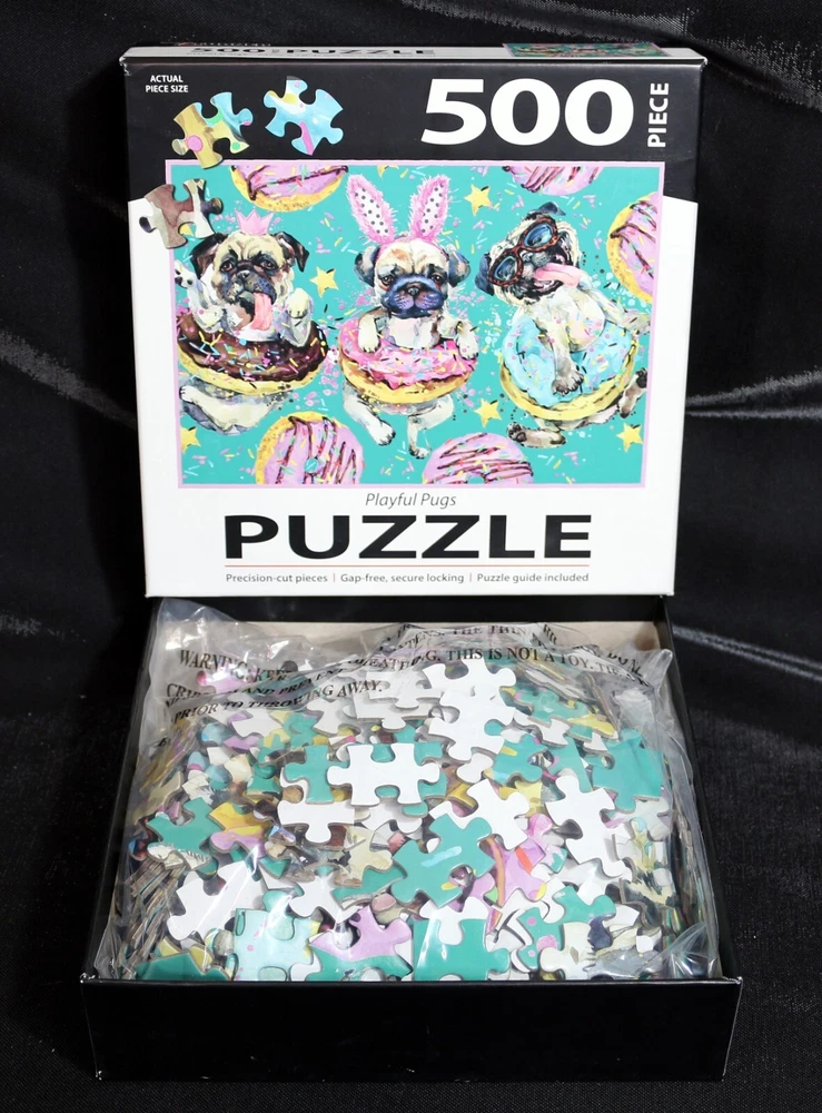 Challenge your mind with this Playful Pugs 500 piece jigsaw puzzle, featuring adorable and colorful pug dogs. This puzzle is perfect for puzzle enthusiasts of all ages, with interlocking pieces that are bagged and a reference poster included. The puzzle measures 24" x 18" once completed, and is made from durable cardboard material. The puzzle is manufactured in China by Turner Licensing, and is recommended for ages 10+. It is a great addition to any collection, and is perfect for family fun or solo relaxation. Get ready to put your puzzle-solving skills to the test with this fun and challenging puzzle. Doing puzzles has some hidden benefits Excellent qualities: Cultivate concentration, patience, and temper your will Movement development: Train hand-eye coordination and precise small movements Spatial intelligence: Improve visual discrimination of colors and shapes Critical thinking ability: Understand the relationship between parts and the whole, and draw inferences from one example to explore the future Relaxes your mind: Relieve work pressure and release yourself Brain development: Enhance memory and may help prevent or slow brain degeneration Anticipated Benefits of Puzzles for Children Overcoming attention deficit Strengthening visual memory Improving problem-solving skills Strengthening hand-eye coordination Improve fine motor skills Improve gross motor skills Shape recognition ability Gain the ability to set goals Learning patience Puzzle pieces are all bagged. Each item we ship is carefully packaged to prevent any damage and is shipped immediately with tracking.
