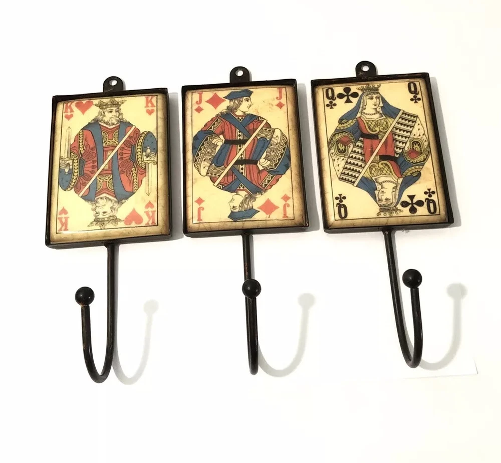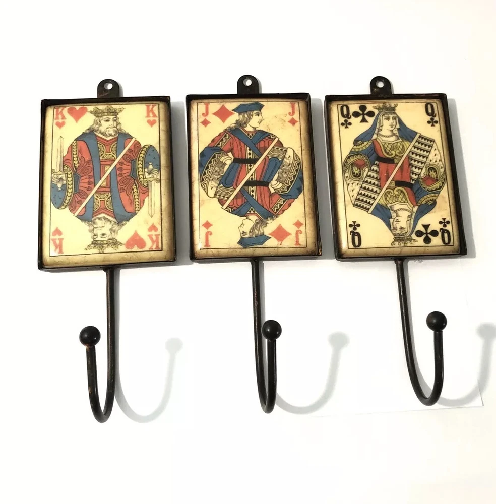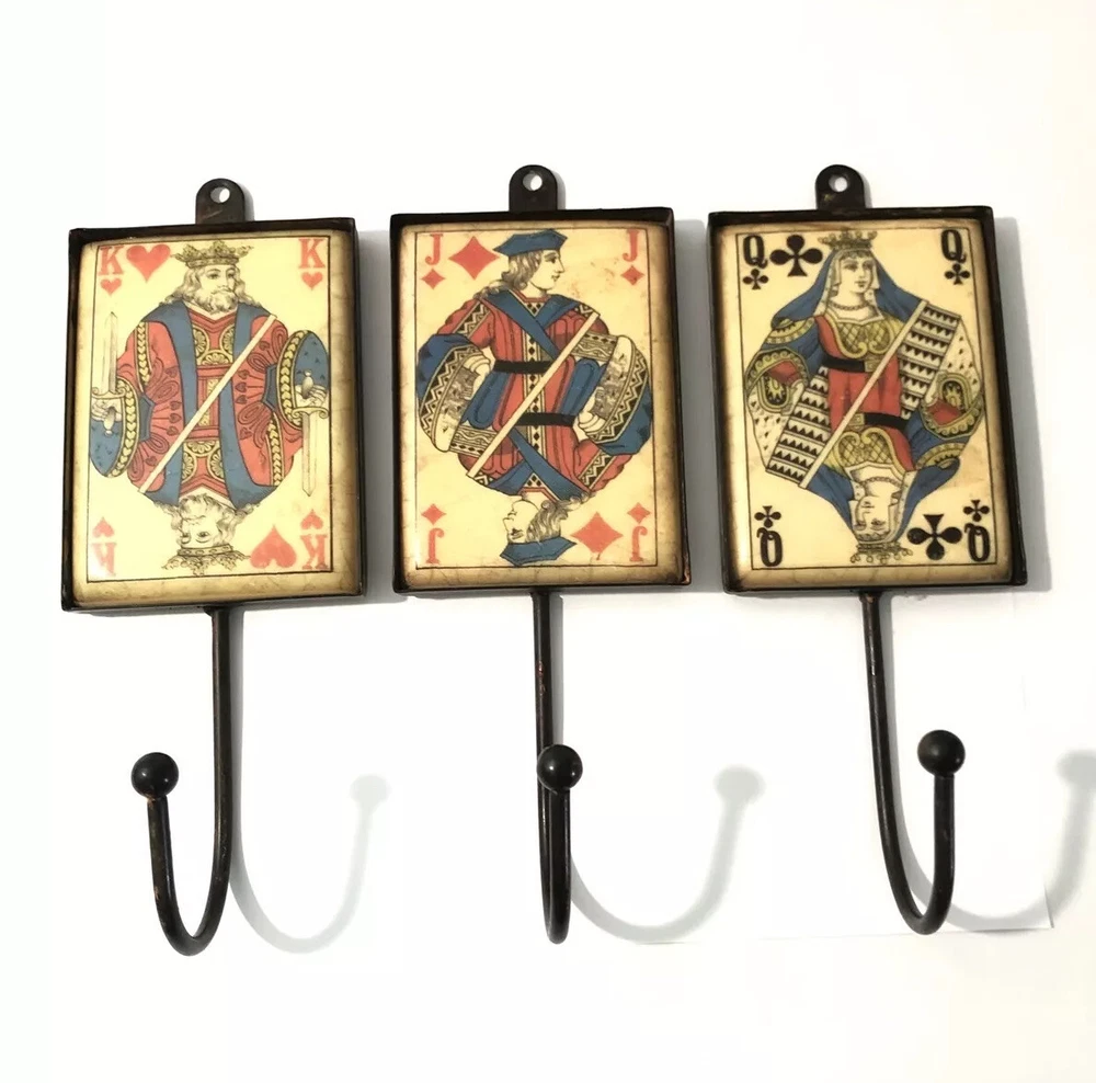 Playing Card Wall Hooks/Hangers-9” Metal & Resin- Distressed. King, Queen, Jack