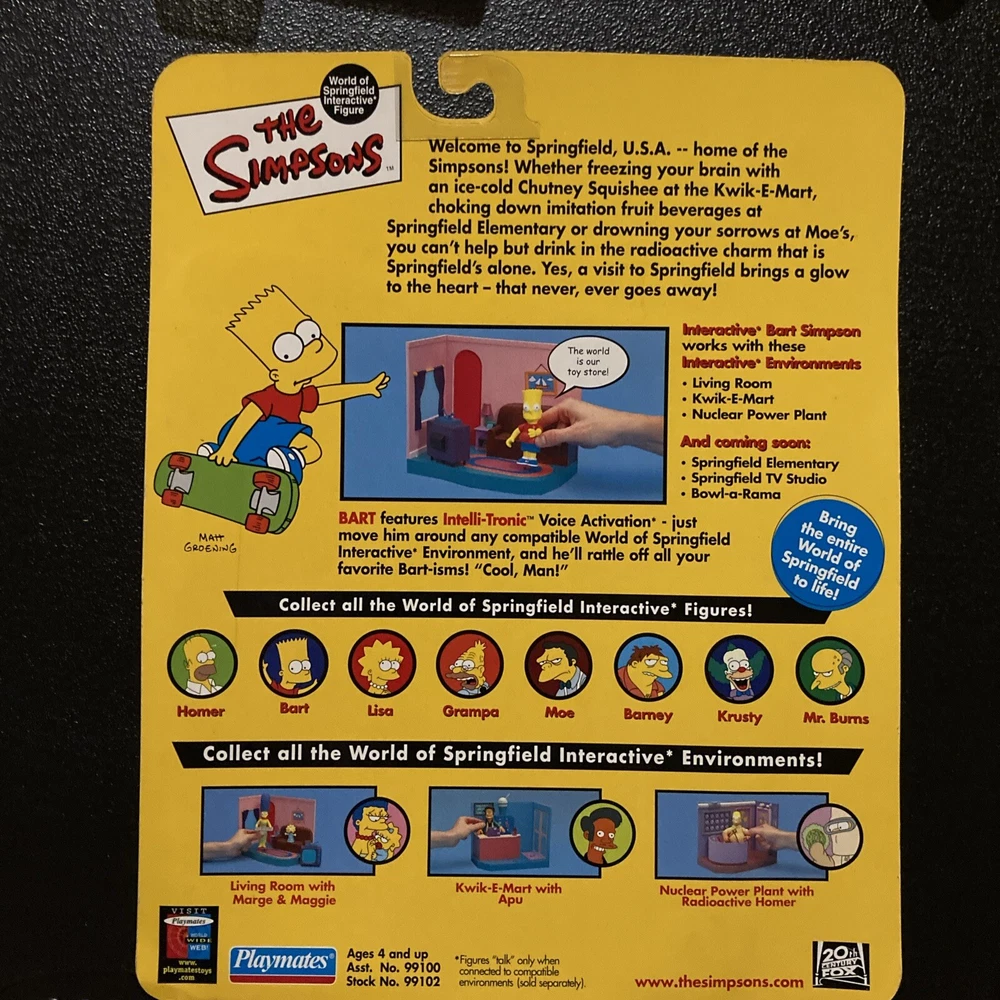 This Playmates Toys action figure features Bart Simpson, the beloved character from The Simpsons TV show. Made of plastic and manufactured in China in the year 2000, this vintage item is a must-have for any fan of the original series. The figure comes boxed and is an original, licensed reproduction. The Bart Simpson action figure is part of the World of Springfield collection and is perfect for collectors or as a gift for someone who loves The Simpsons. With its detailed design and vibrant colors, this figure is sure to bring joy to anyone who sees it. Add this item to your collection today!